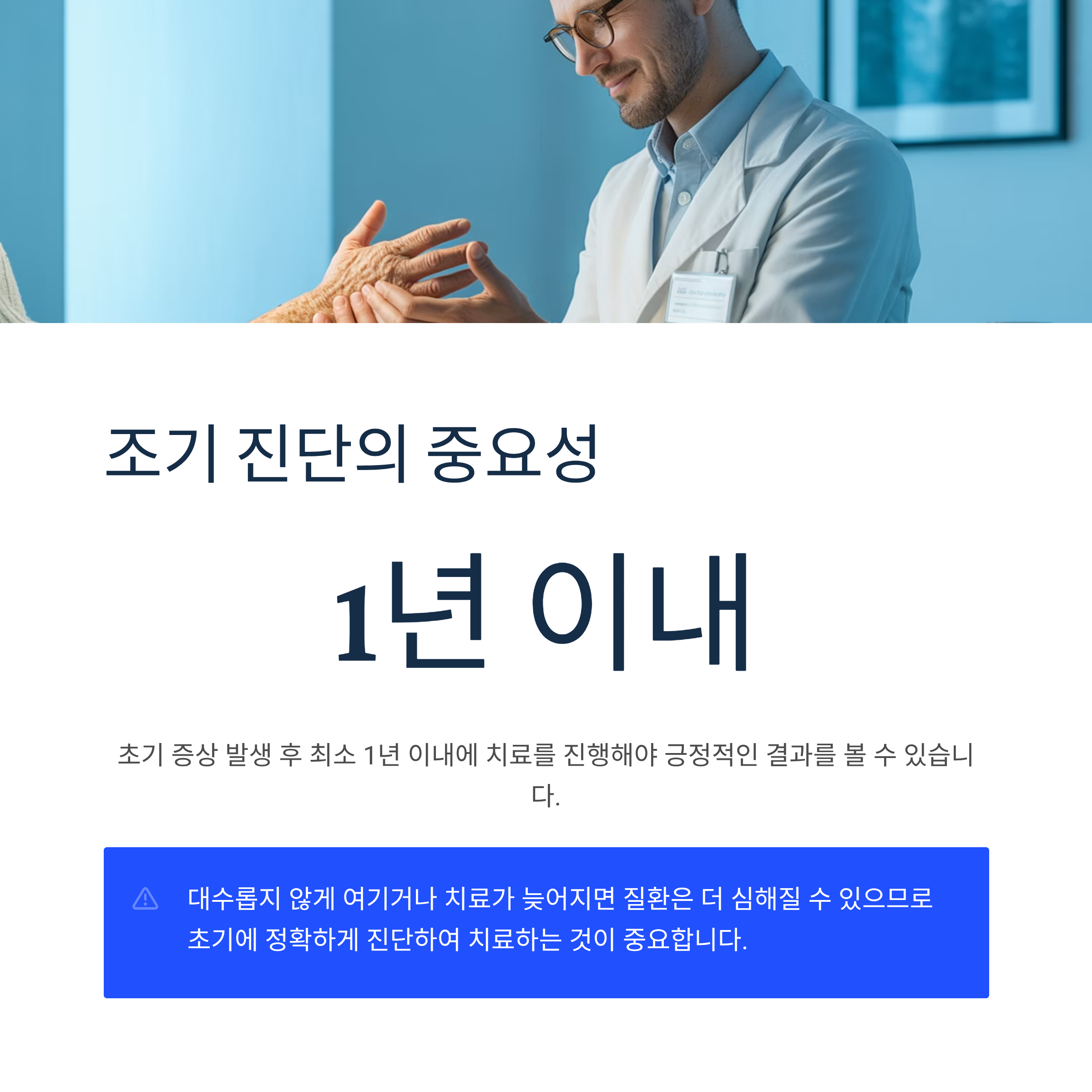초기 증상 발생 후 최소 1년 이내에 치료를 진행해야 긍정적인 결과를 볼 수 있어 질환 초기에 증상을 발견하는 것이 매우 중요합니다. 대수롭지 않게 여기거나 치료가 늦어지면, 질환은 더 심해질 수 있으므로 초기에 정확하게 진단하여 치료하는 것이 중요합니다.