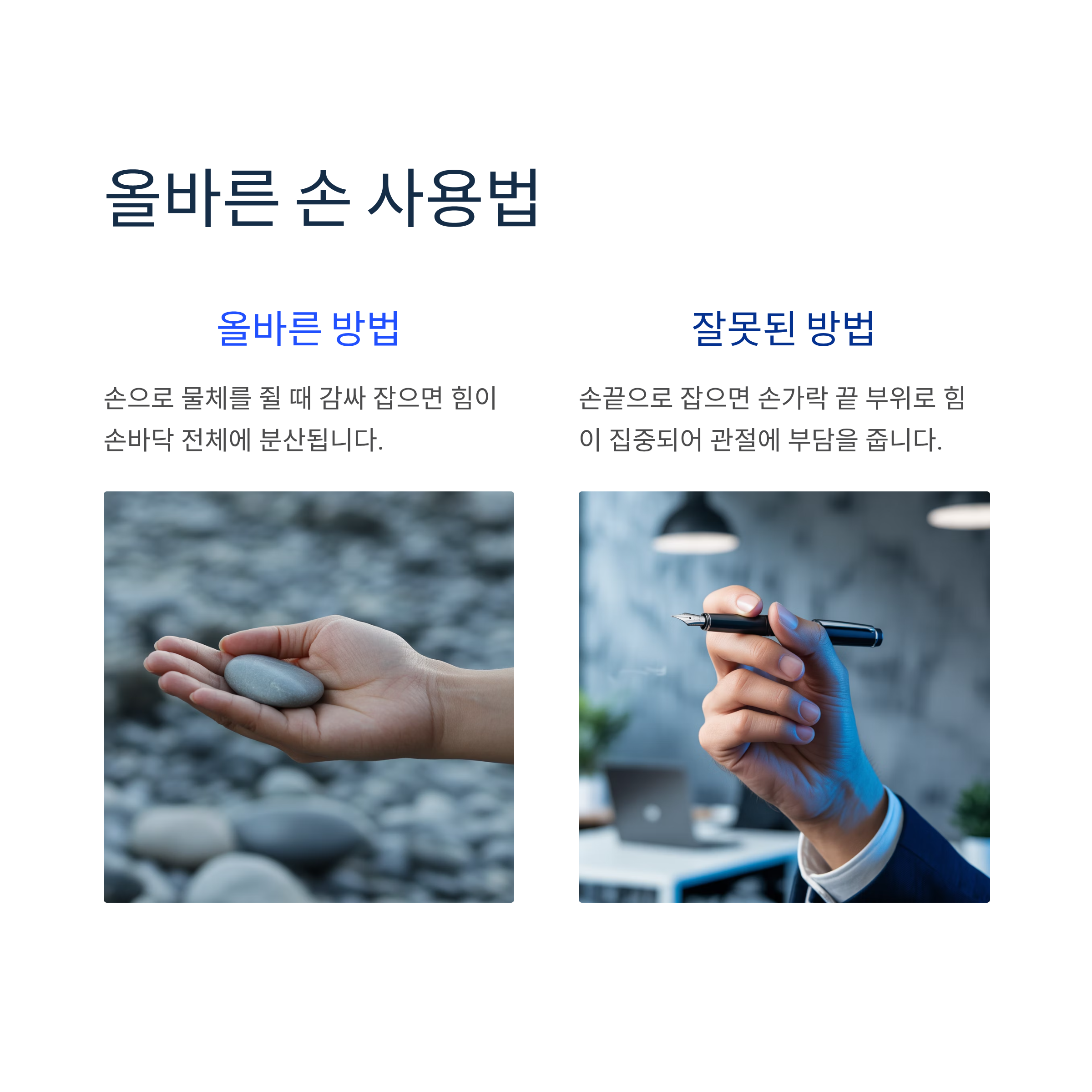 적당한 운동과 규칙적인 생활, 비만하지 않도록 과식에 주의하는 것이 중요합니다. 손으로 물체를 쥘 때 감싸 잡으면 힘이 손바닥에 전체적으로 분산되지만, 손끝으로 잡으면 손가락 끝 부위로 힘이 집중되므로 올바른 손 사용법을 익혀야 합니다.