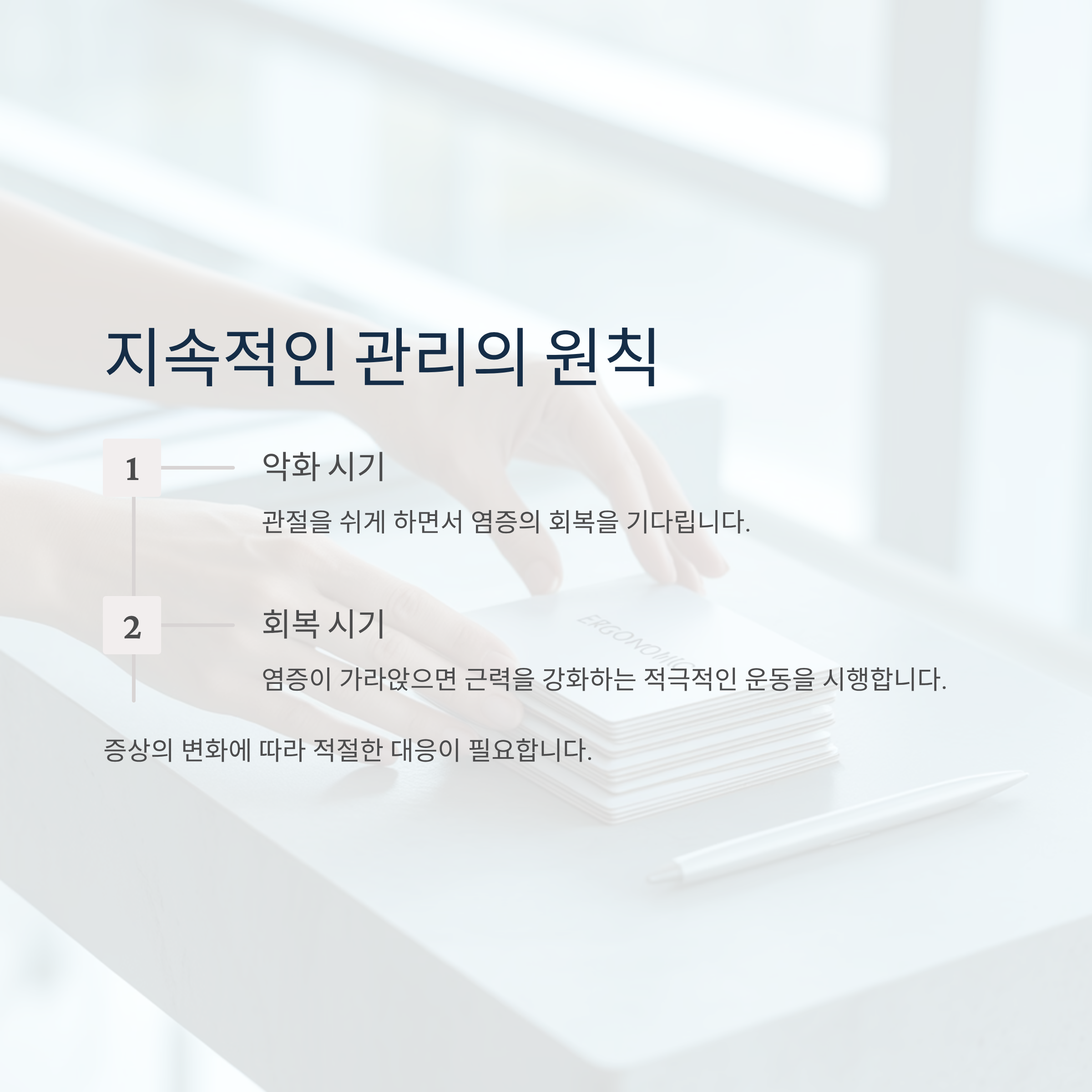 증상이 악화됐을 때는 관절을 쉬게 하면서 염증의 회복을 기다리고 염증이 가라앉으면 근력을 강화하는 적극적인 운동을 시행하는 것이 필요합니다.