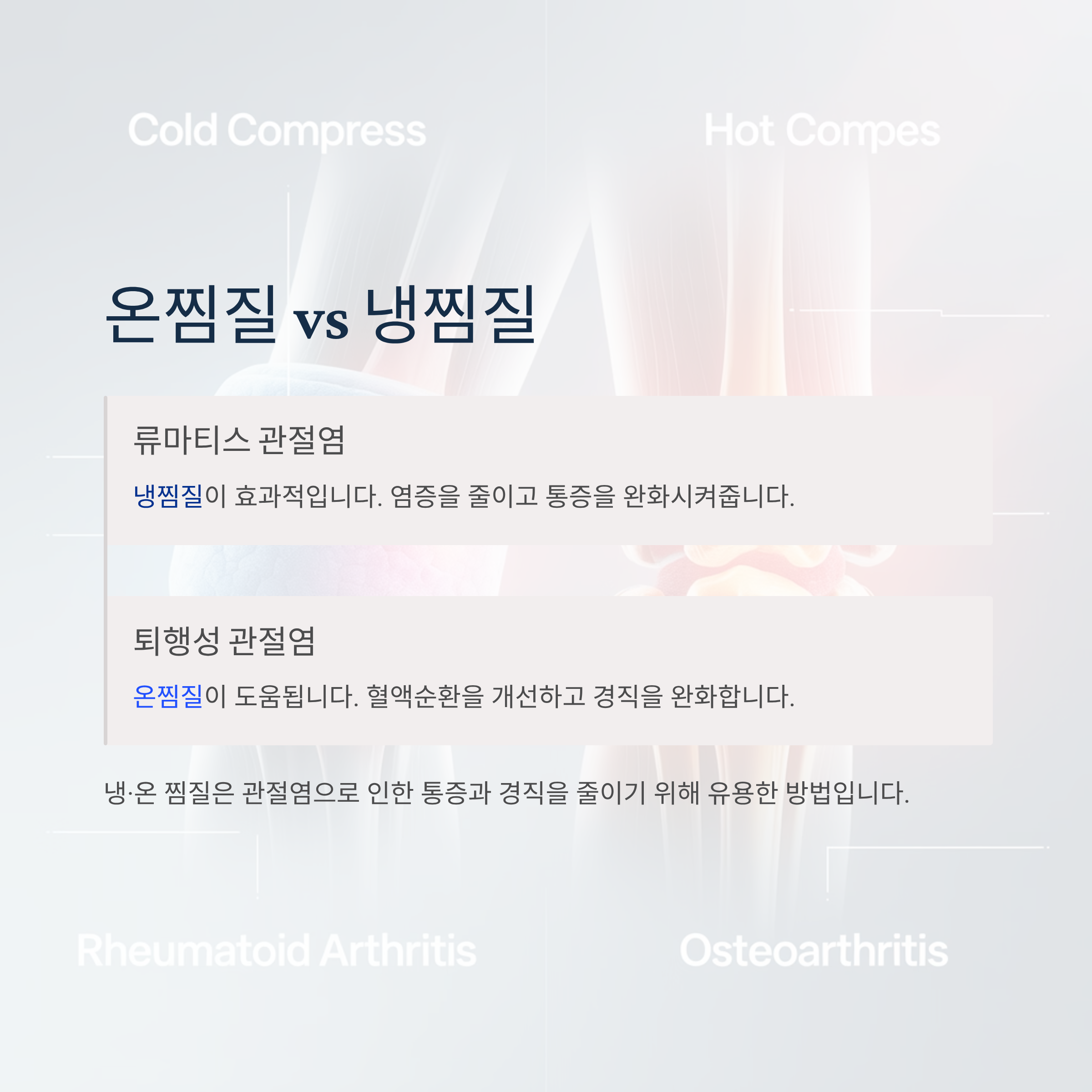 류마티즘 관절염엔 냉찜질을, 퇴행성 관절염엔 온찜질을 하는 것이 도움되며, 냉·온 찜질은 관절염으로 인한 통증과 경직을 줄이기 위해 유용합니다.