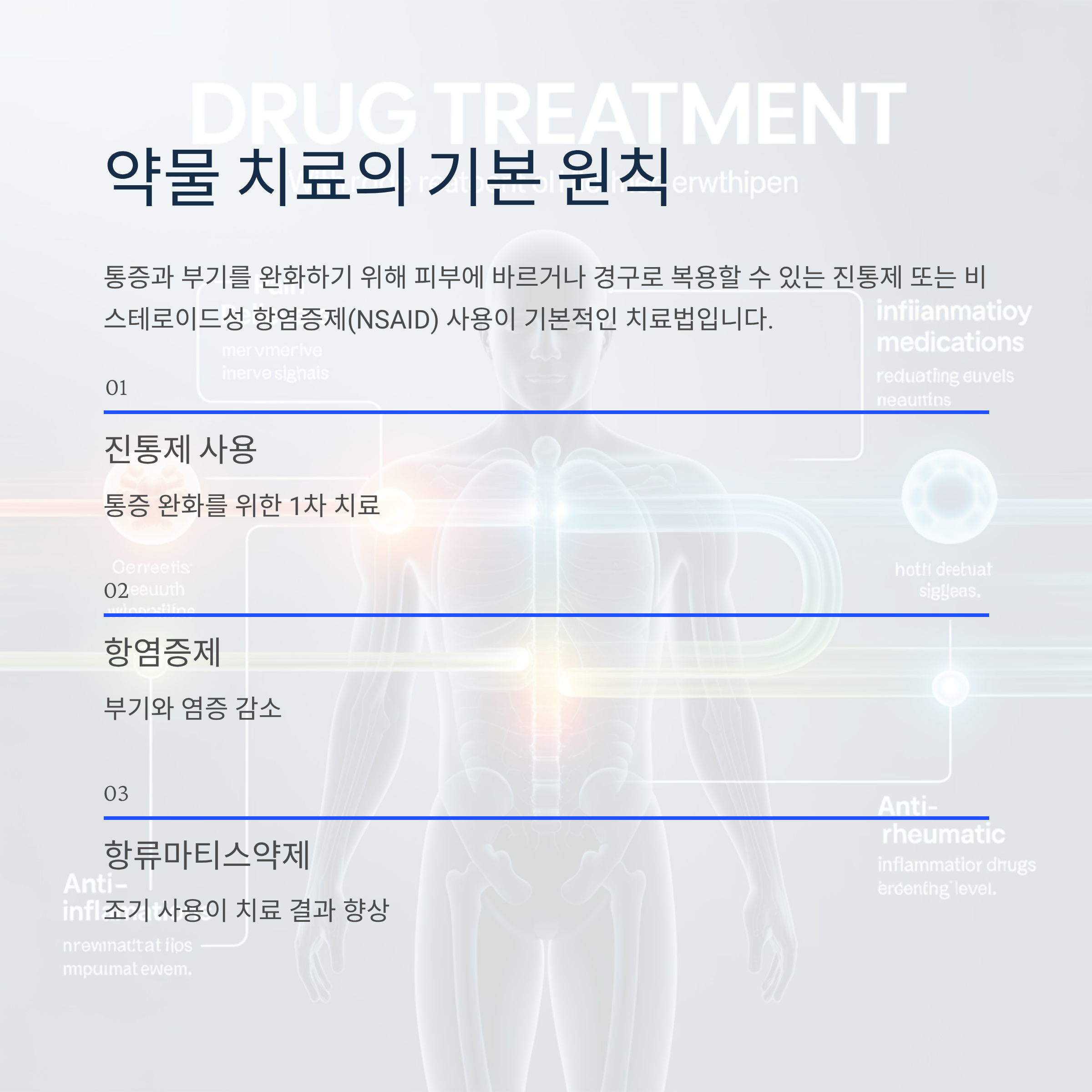 통증과 부기를 완화하기 위해 피부에 바르거나 경구로 복용할 수 있는 진통제 또는 비스테로이드성 항염증제(NSAID) 사용이 기본적인 치료법입니다. 항류마티스약제는 조기에 치료를 시작할수록 치료 결과가 좋기 때문에 조기 진단 및 조기 사용이 중요합니다.