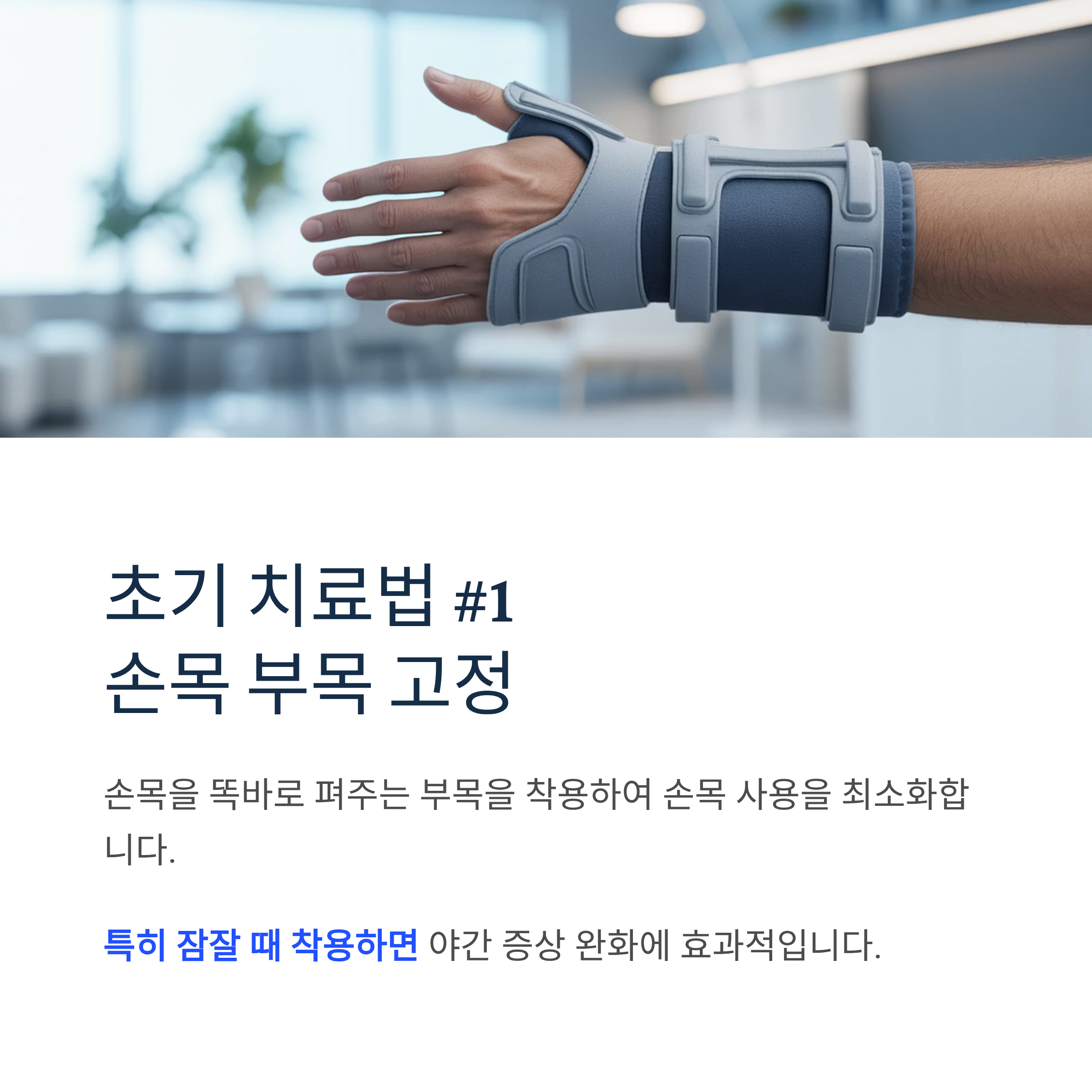 손목을 똑바로 펴주는 부목을 착용하여 손목 사용을 최소화합니다. 특히 잠잘 때 착용하면 야간 증상 완화에 효과적입니다.