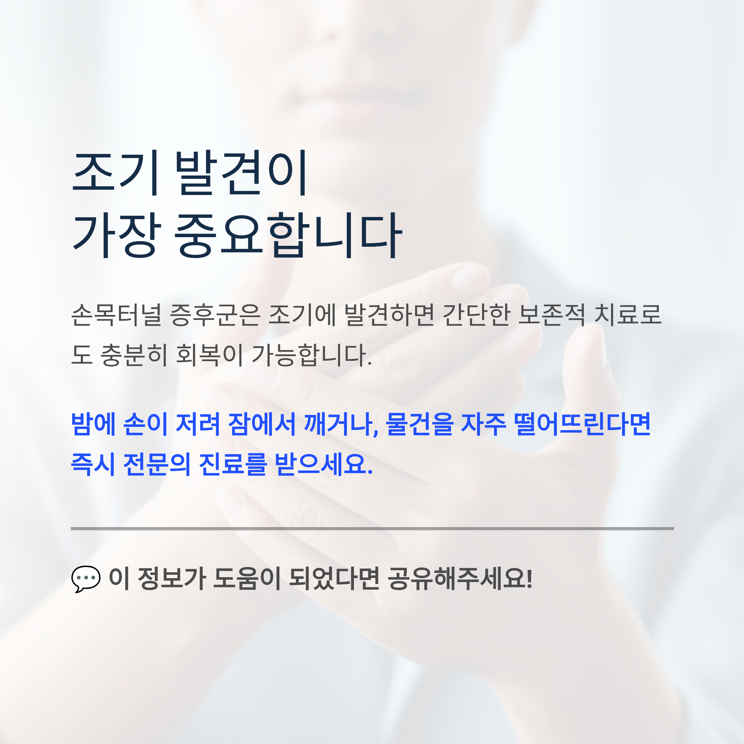 손목터널 증후군은 조기에 발견하면 간단한 보존적 치료로도 충분히 회복이 가능합니다. 하지만 증상을 방치하면 수술이 불가피하고, 심한 경우 근육 위축으로 일부 증상이 남을 수 있습니다.
