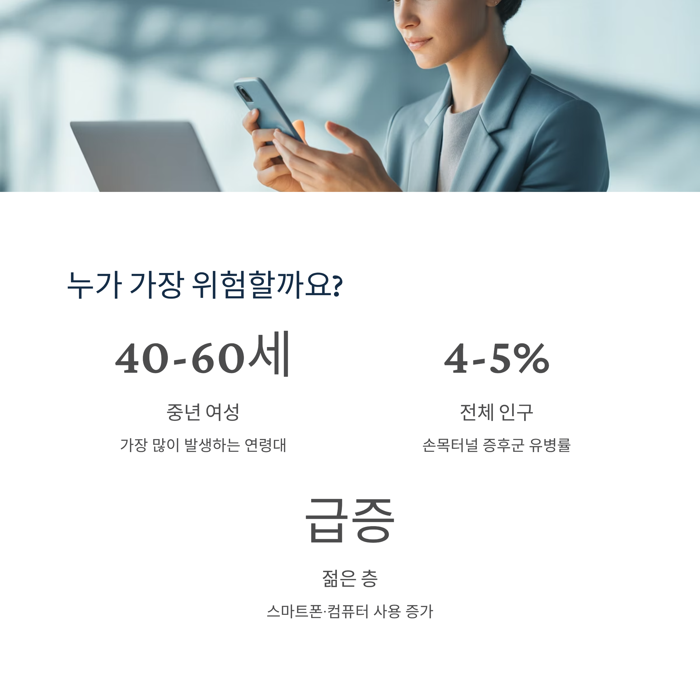 특히 40~60세 중년 여성에게 많이 발생하며, 최근에는 스마트폰과 컴퓨터 사용 증가로 젊은 층에서도 급증하고 있습니다.