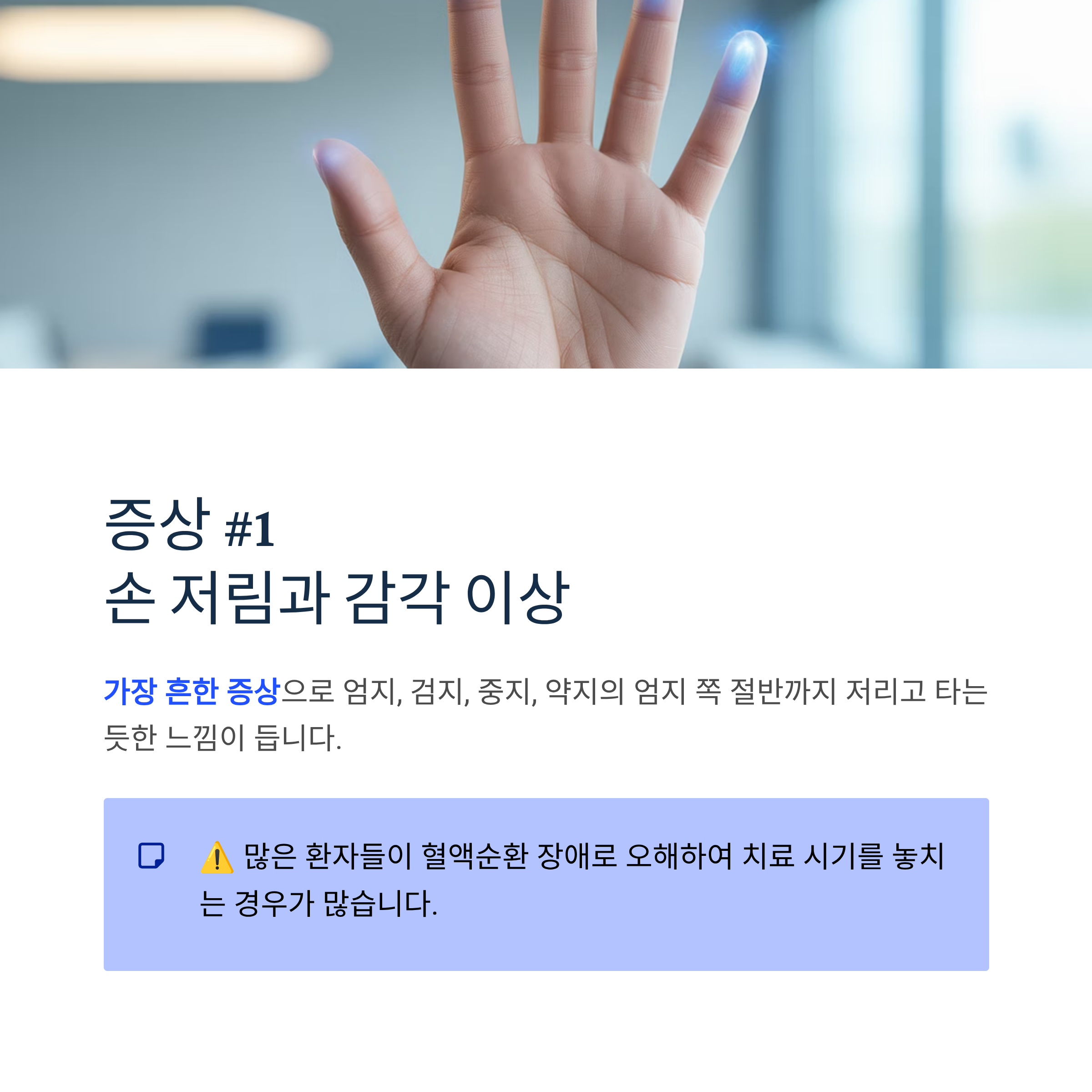 엄지, 검지, 중지, 약지의 엄지 쪽 절반까지 저리고 타는 듯한 느낌이 듭니다. 많은 환자들이 이를 혈액순환 장애로 오해하여 치료 시기를 놓치는 경우가 많습니다.