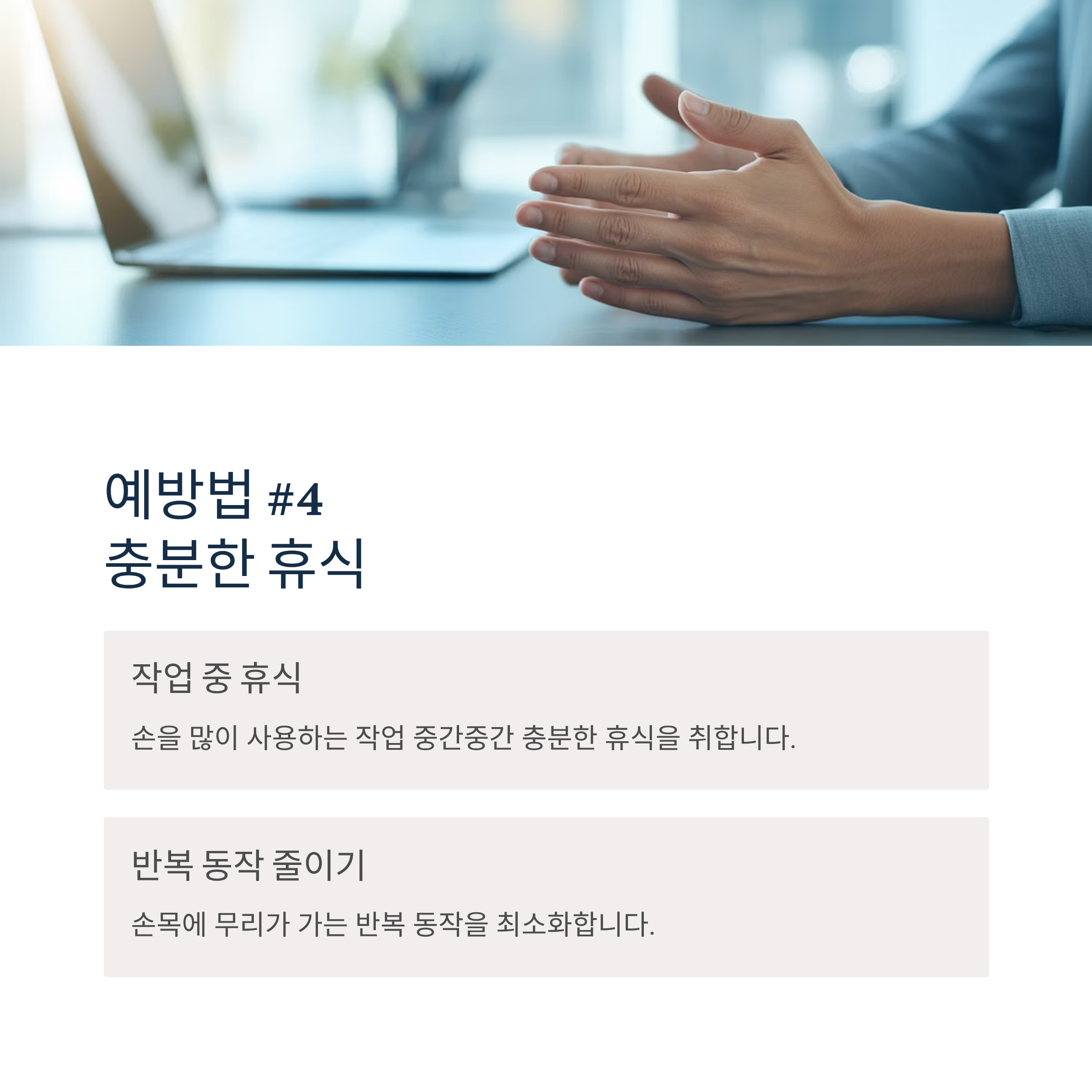 손을 많이 사용하는 작업 중간중간 충분한 휴식을 취하고, 손목에 무리가 가는 반복 동작을 줄입니다.