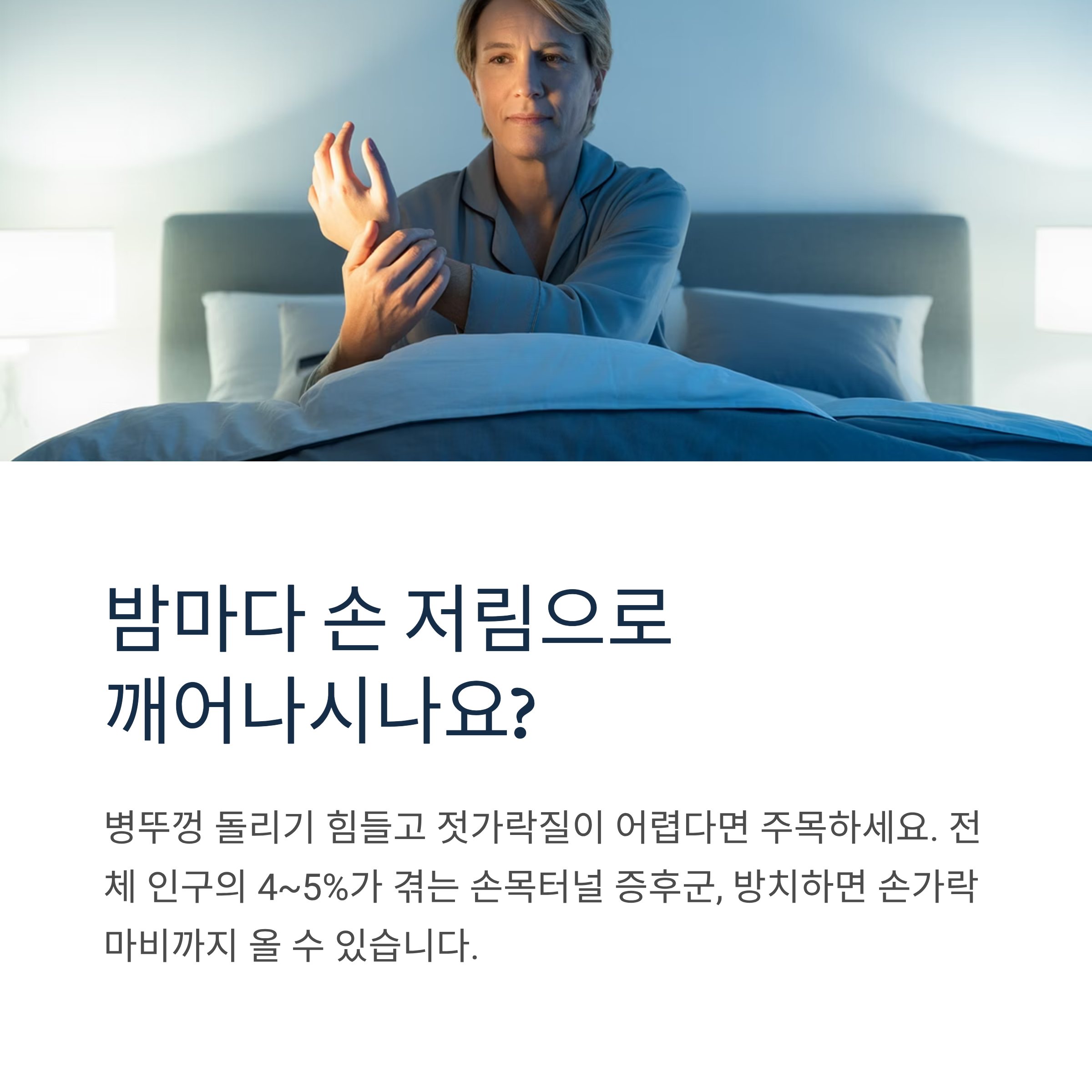 밤에 잠을 자다가 손이 저려서 깨는 것이 손목터널 증후군의 가장 특징적인 증상입니다. 손을 털거나 주물러야 증상이 완화됩니다.