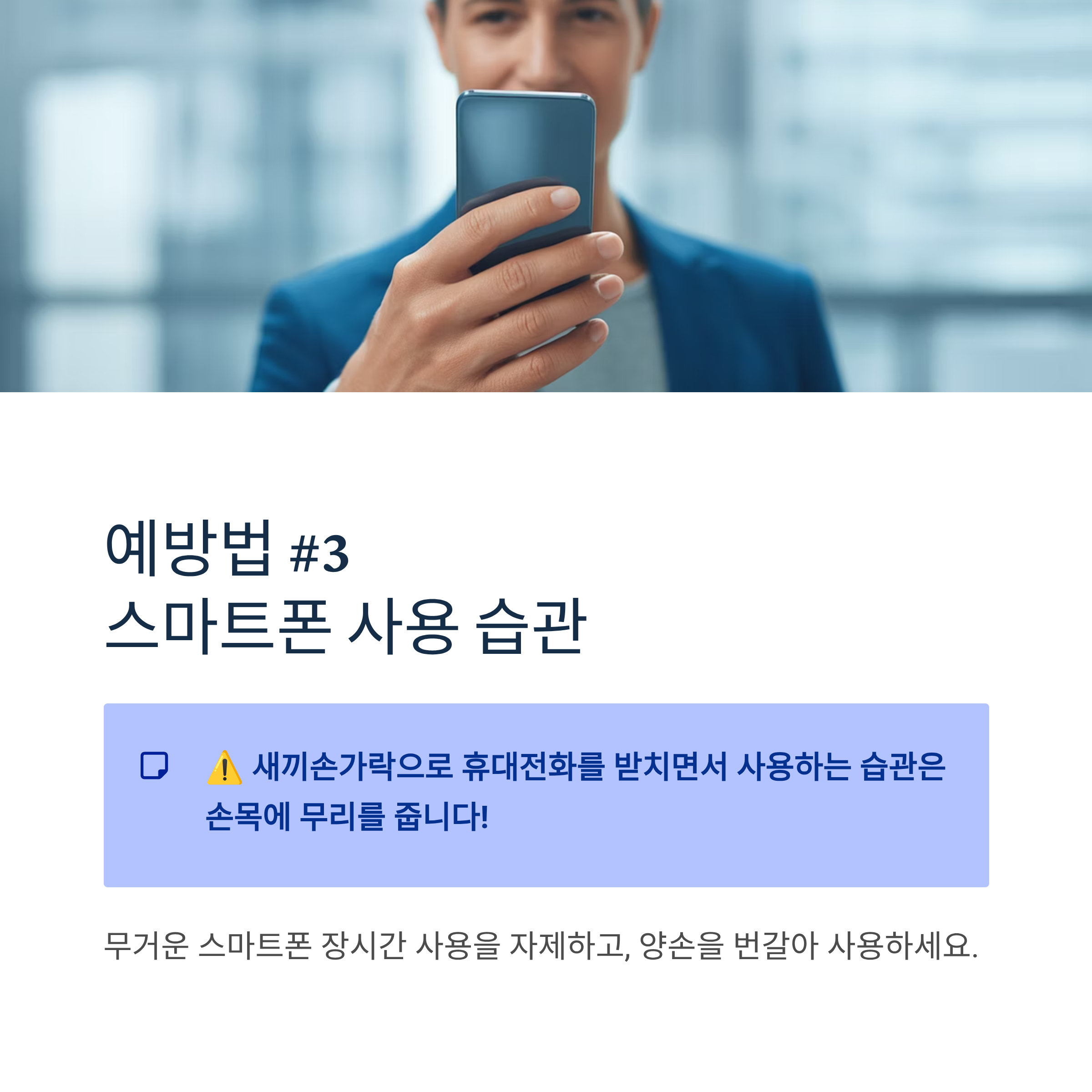 특히 새끼손가락으로 휴대전화를 받치면서 사용하는 습관은 손목에 무리를 줍니다.