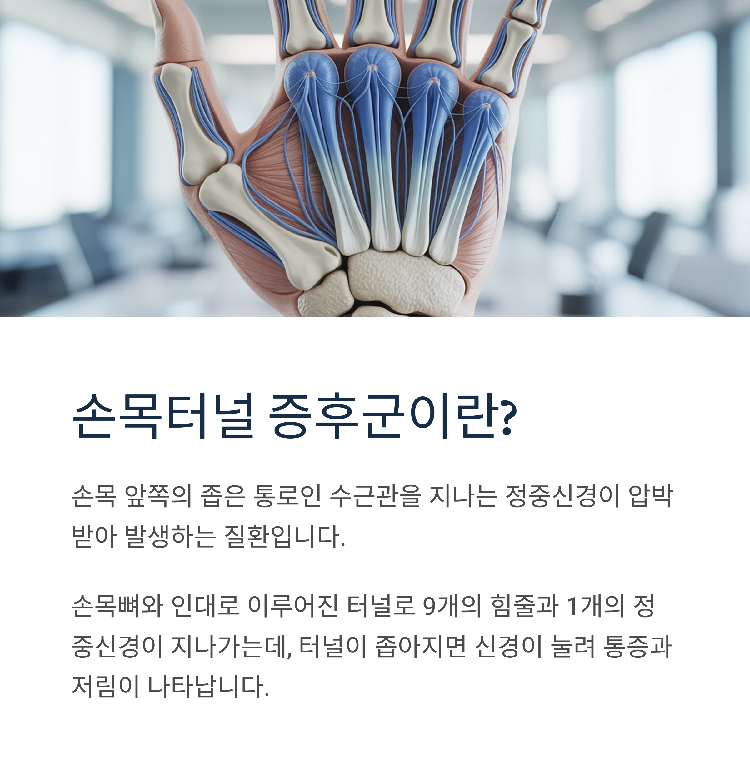 손목터널 증후군(수근관 증후군)은 손목 앞쪽의 좁은 통로인 수근관을 지나는 정중신경이 압박받아 발생하는 질환입니다. 손목뼈와 인대로 이루어진 이 터널로는 9개의 힘줄과 1개의 정중신경이 지나가는데, 여러 원인으로 터널이 좁아지거나 압력이 증가하면 신경이 눌려 통증과 저림 증상이 나타납니다.