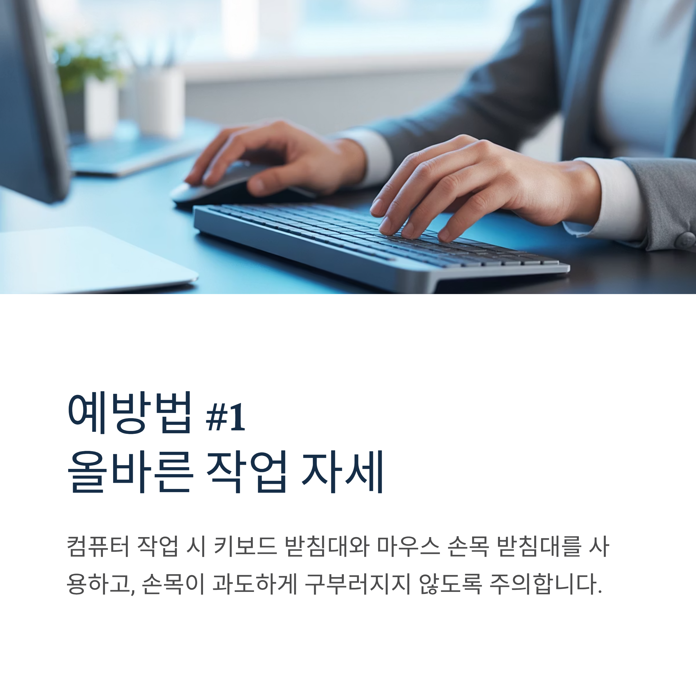 컴퓨터 작업 시 키보드 받침대와 마우스 손목 받침대를 사용하고, 손목이 과도하게 구부러지지 않도록 주의합니다.