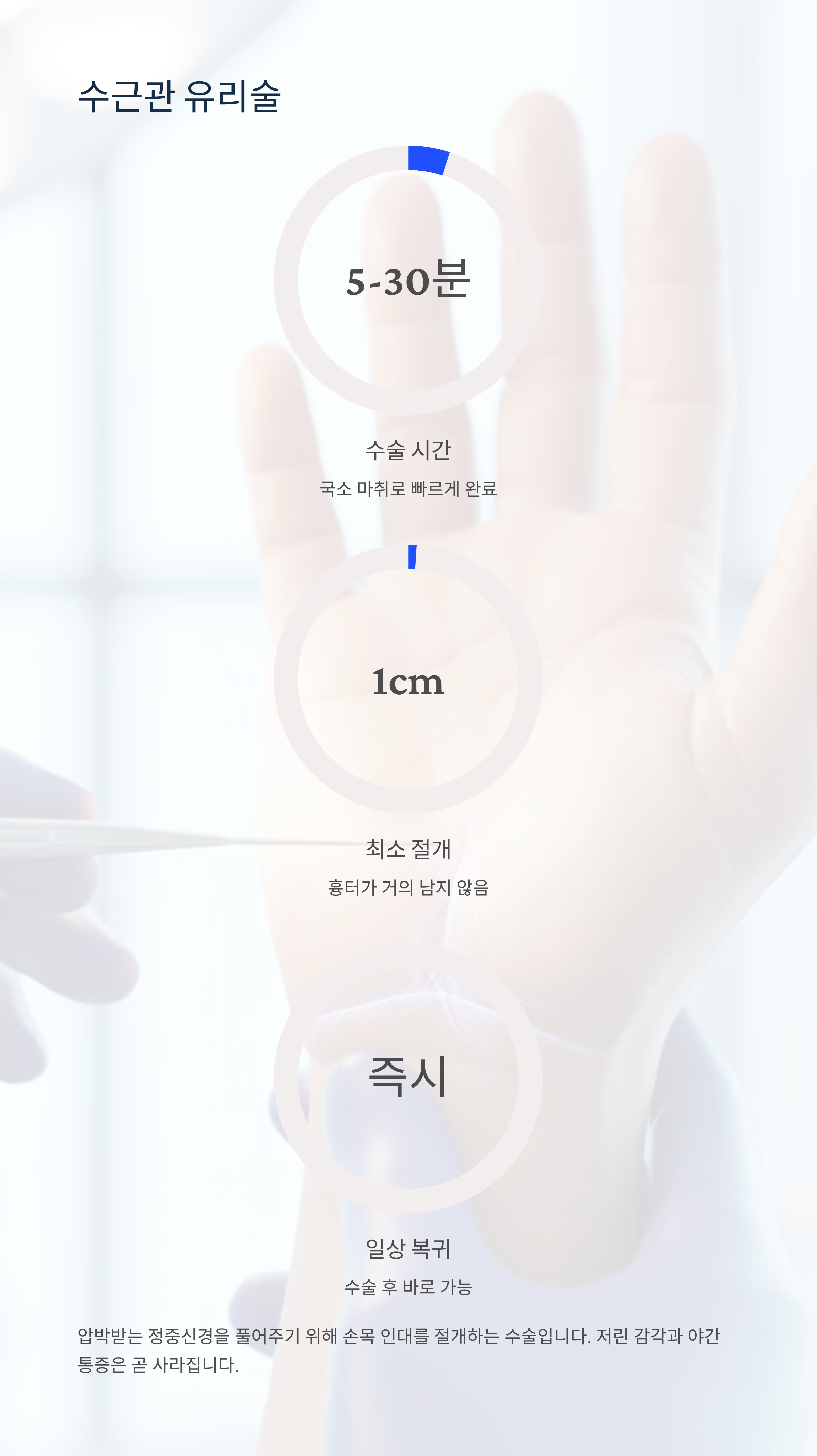 수근관 유리술은 압박받는 정중신경을 풀어주기 위해 손목 인대를 절개하는 수술입니다. 국소 마취로 5~30분 내에 완료되며, 최근에는 1cm 정도만 최소 절개하여 흉터가 거의 남지 않습니다. 수술 후 바로 일상생활이 가능하며, 저린 감각과 야간 통증은 곧 사라집니다.