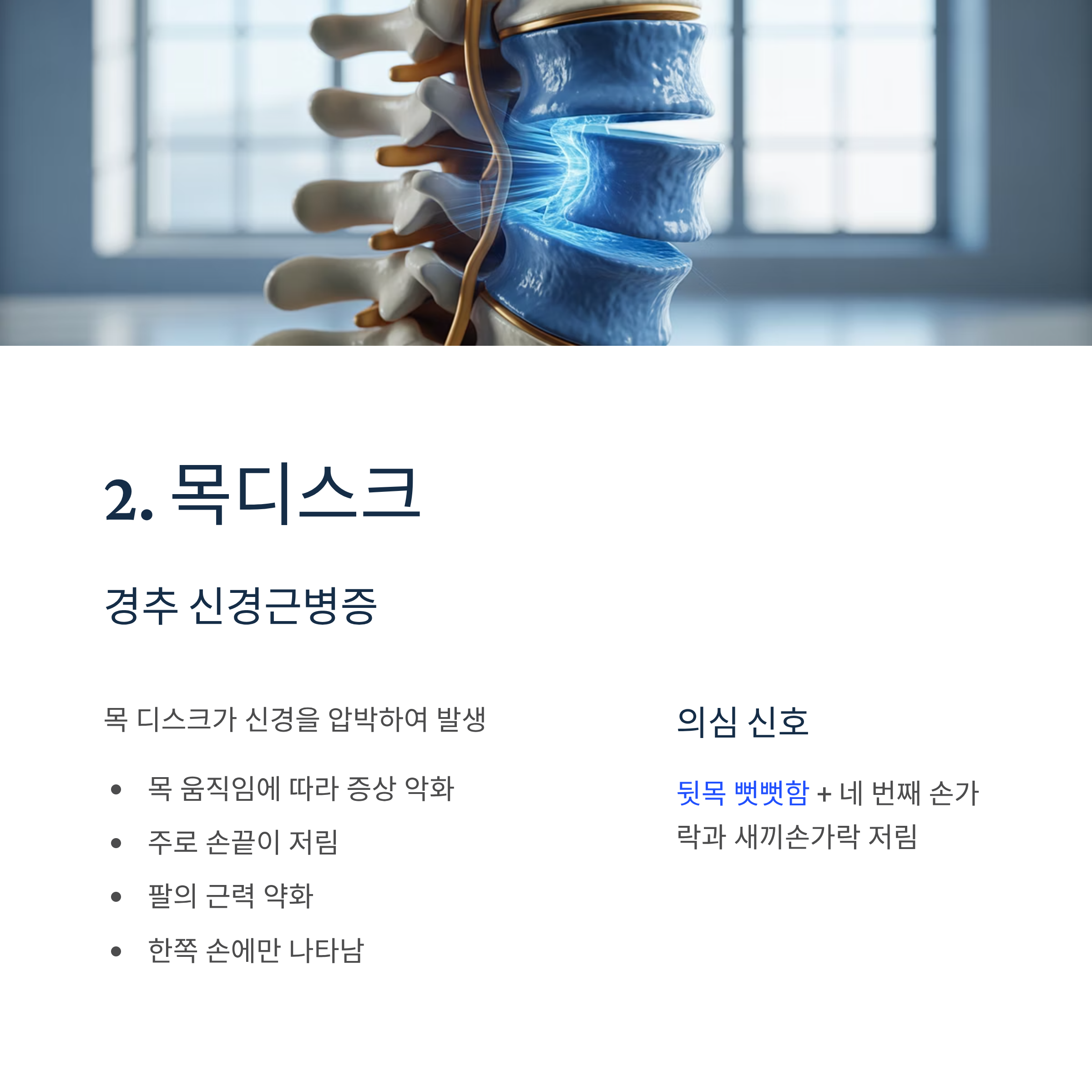 - 약지~새끼손가락: 목디스크 또는 팔꿈치터널증후군