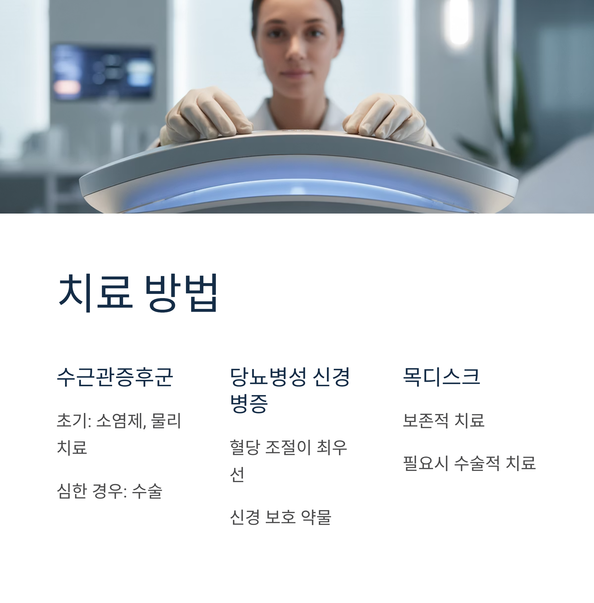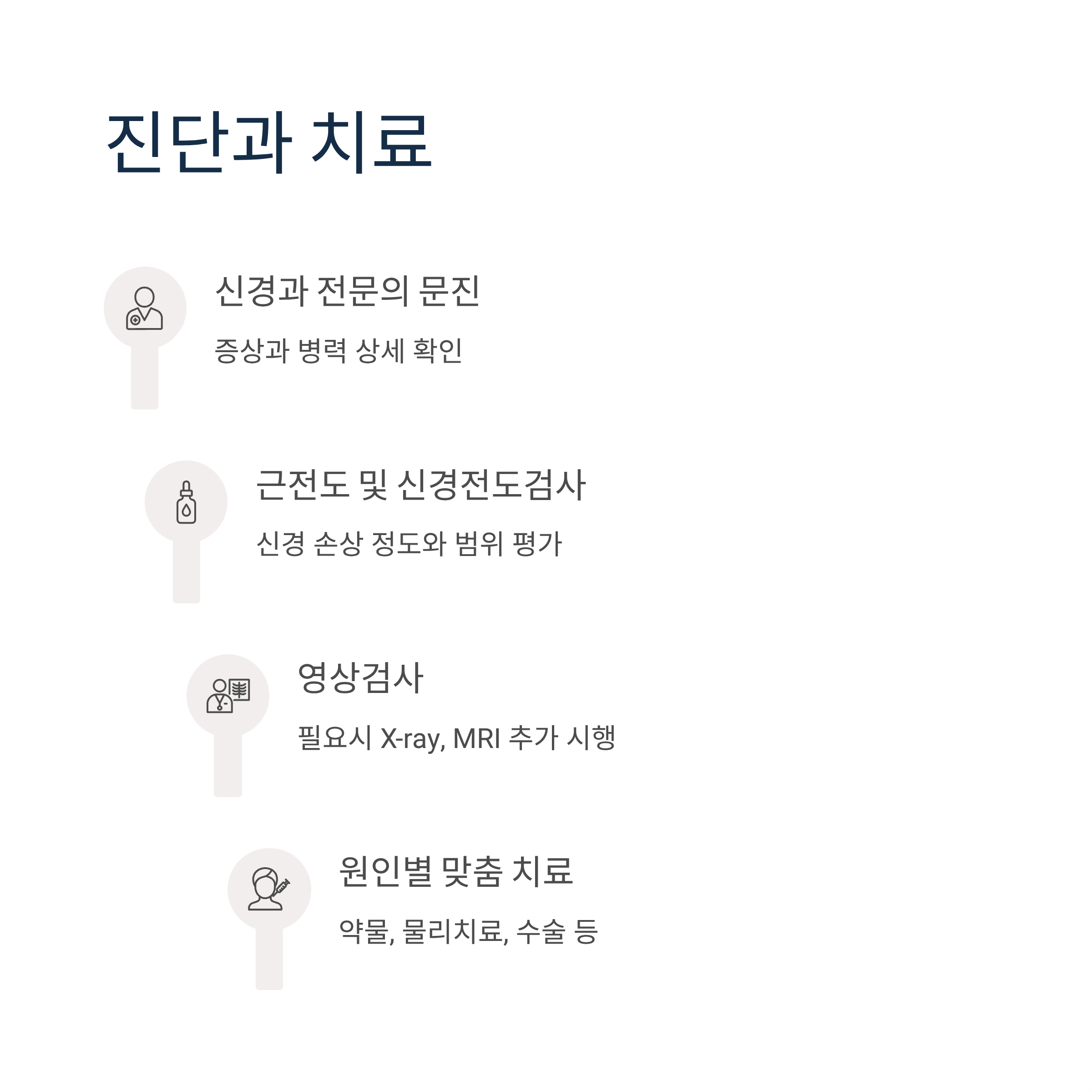 치료는 원인에 따라 달라집니다. 수근관증후군 초기에는 손목을 쓰는 일을 줄이고 소염제와 물리치료로 호전될 수 있으나, 증상이 심하면 수술이 필요할 수 있습니다. 당뇨병성 신경병증은 혈당 조절이 최우선이며, 목디스크는 보존적 치료나 수술적 치료를 고려합니다.