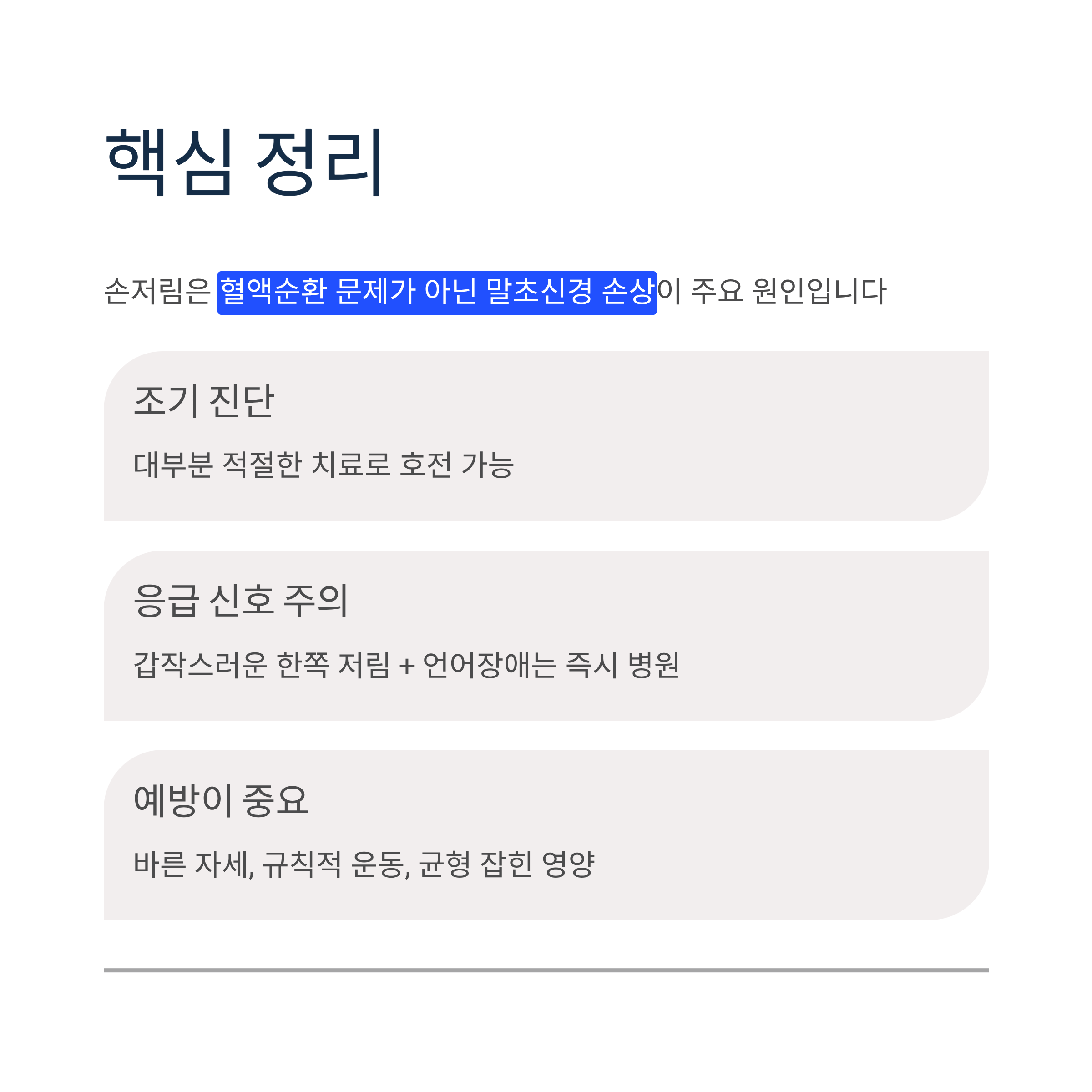 손저림은 단순한 혈액순환 문제가 아닌, 말초신경 손상이 주요 원인입니다. 어느 손가락이 저린지, 언제 심해지는지, 한쪽인지 양쪽인지를 관찰하면 원인을 어느 정도 유추할 수 있습니다. 특히 갑작스러운 한쪽 손 저림과 함께 언어장애나 어지러움이 동반되면 즉시 응급실을 방문해야 합니다.