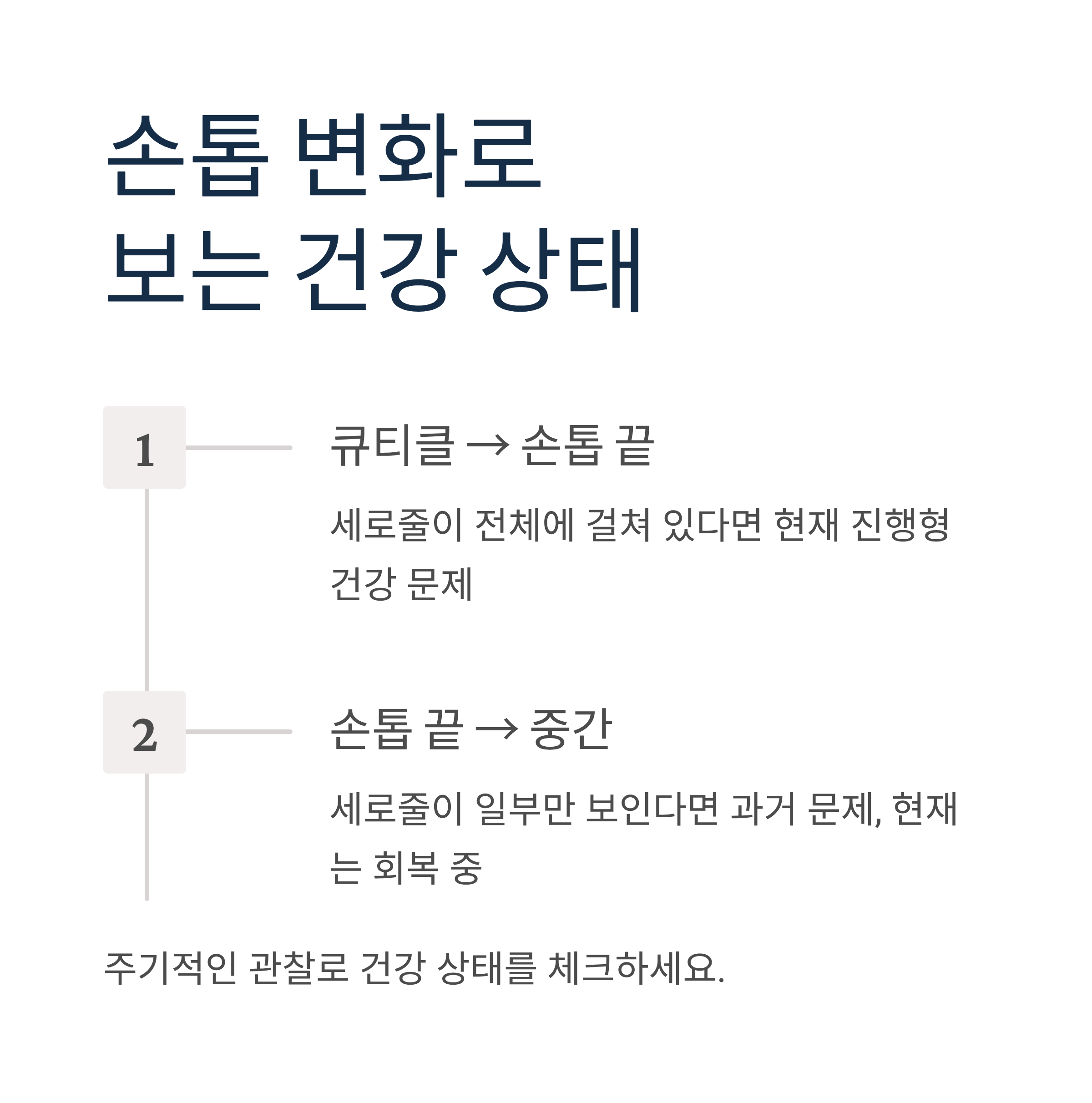 무엇보다 손톱의 변화를 주기적으로 관찰하는 것이 중요합니다. 큐티클 부분에서 손톱 끝까지 세로줄이 뻗어있다면 현재 진행형 건강 문제를, 손톱 끝에서 중간까지만 세로줄이 보인다면 과거에 문제가 있었지만 지금은 회복 중임을 의미합니다.