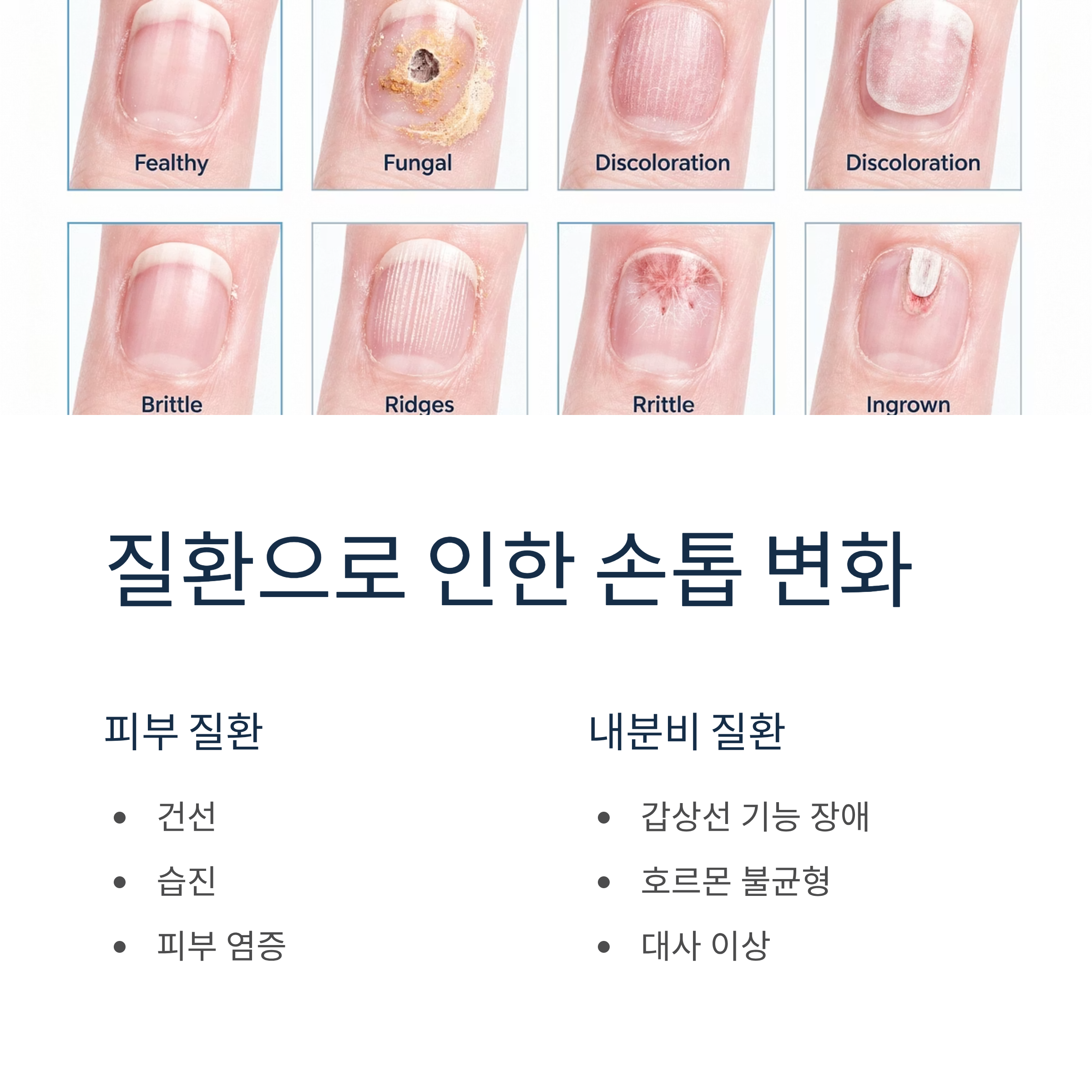 그 외에도 화학세제나 물에 자주 노출되거나, 매니큐어를 반복적으로 바르고 제거하는 등의 물리적·화학적 손상이 세로줄의 원인이 될 수 있습니다. 건선, 습진 같은 피부 질환이나 갑상선 기능 장애 같은 내분비 질환도 손톱 상태에 영향을 미칩니다.