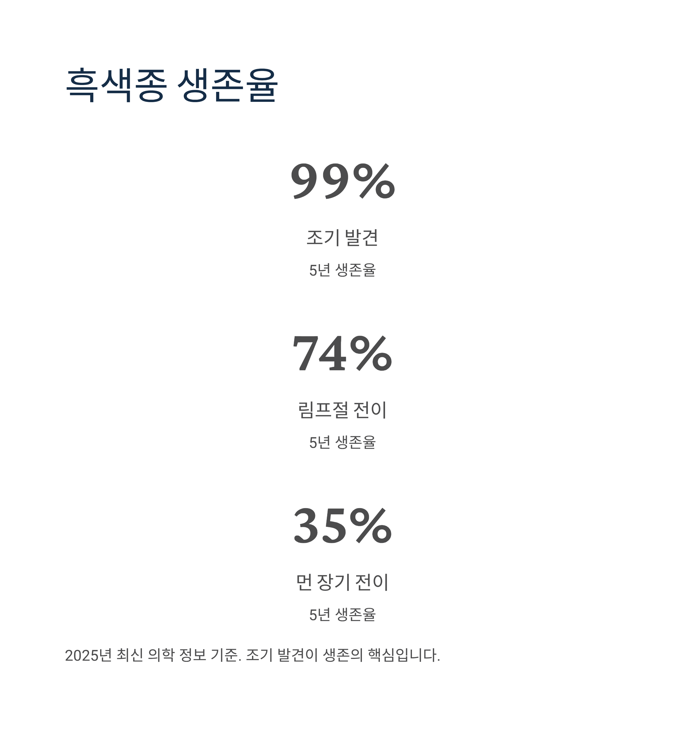 하지만 손발톱밑 흑색종은 악성 피부암으로, 전체 흑색종의 0.7~3.5%에 해당하는 드문 질환이지만 전이와 재발이 쉬워 매우 위험합니다. 2025년 최신 의학 정보에 따르면 조기 발견 시 5년 생존율이 99%에 달하지만, 림프절로 전이되면 74%, 먼 장기로 전이되면 35%까지 떨어집니다.