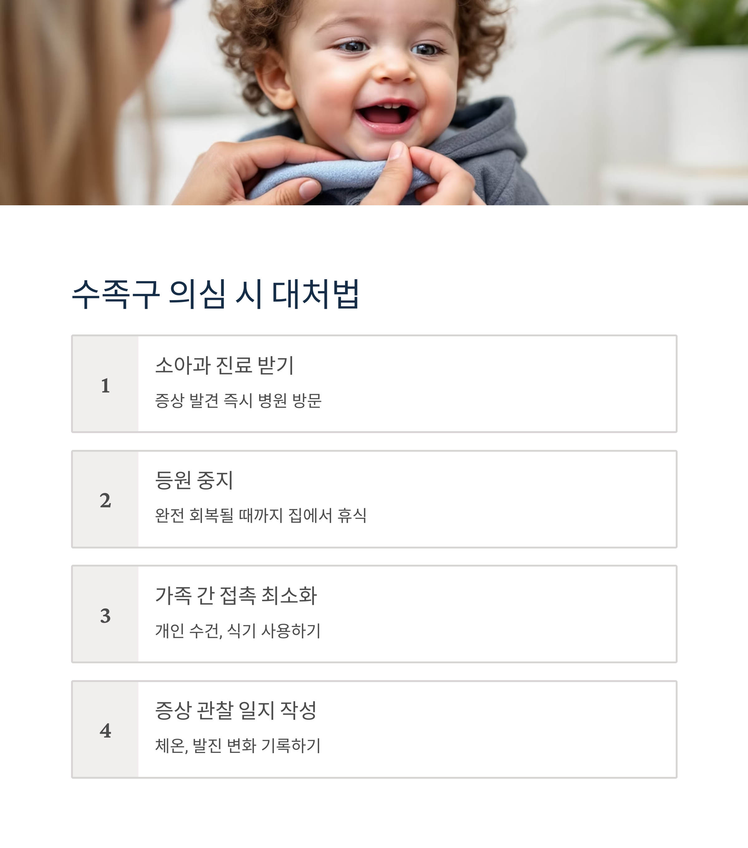 우리 아이의 건강을 지키기 위해 일상적인 손 씻기부터 시작해보세요. 의심 증상이 나타나면 즉시 소아과 진료를 받고, 완전 회복 시까지 등원을 중지하여 다른 아이들에게 전파되지 않도록 주의해야 합니다.