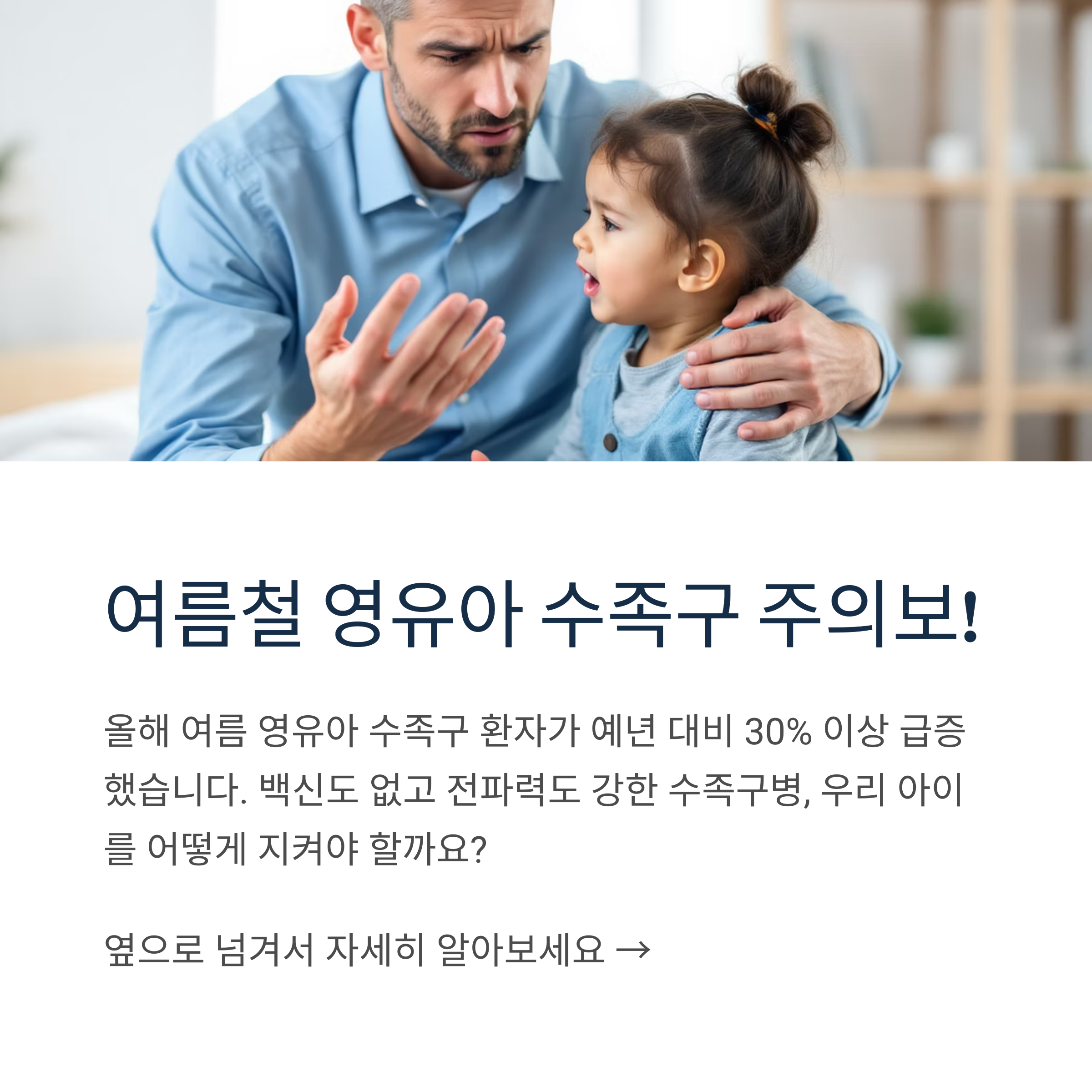 여름철 영유아 수족구는 백신이 없고 전파력이 강해 예방이 무엇보다 중요합니다. 하지만 올바른 위생관리와 적절한 대처법을 알고 있다면 충분히 예방 가능한 질병입니다.