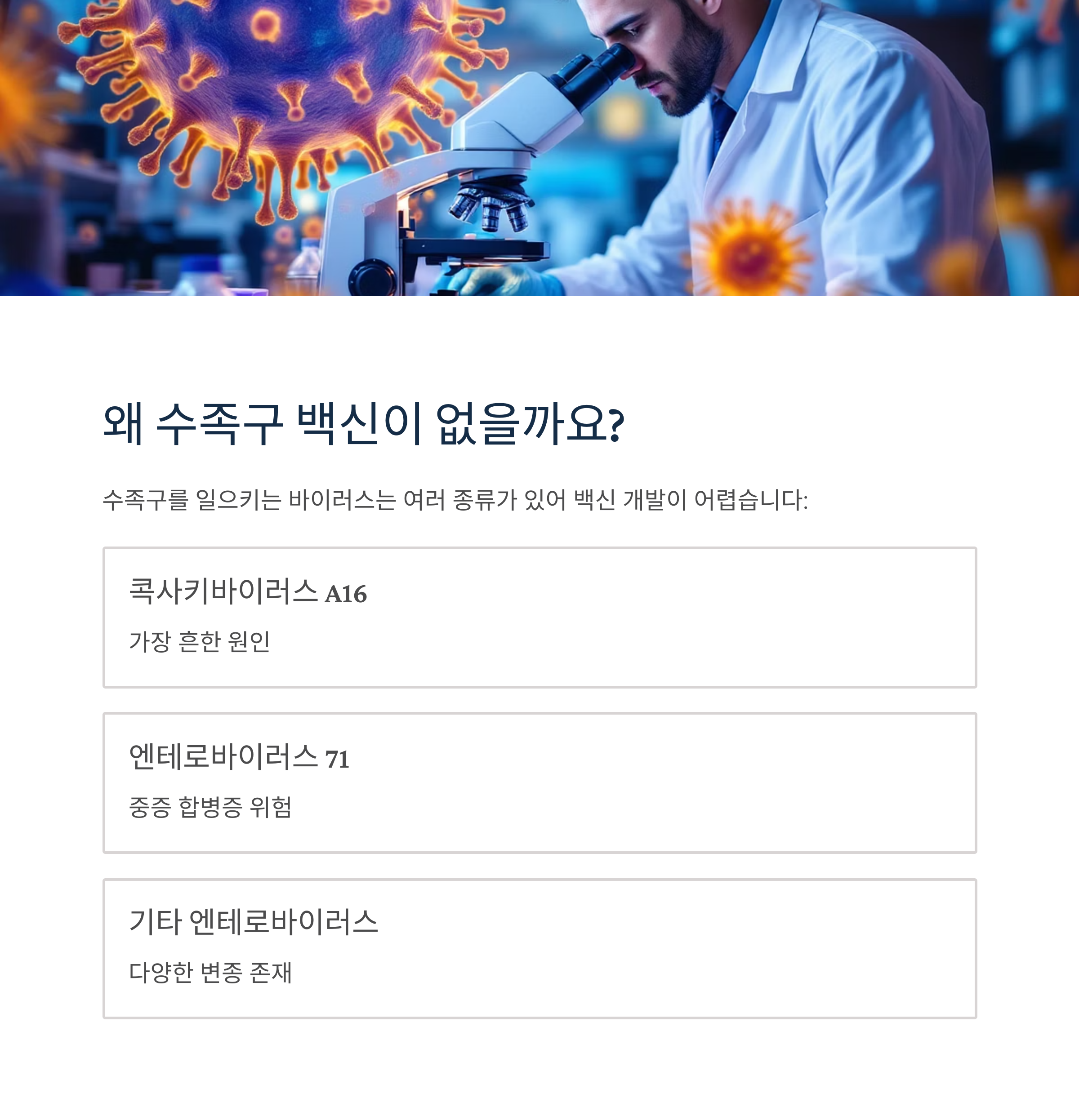 수족구를 일으키는 바이러스는 여러 종류가 있어 백신 개발이 까다롭습니다:
