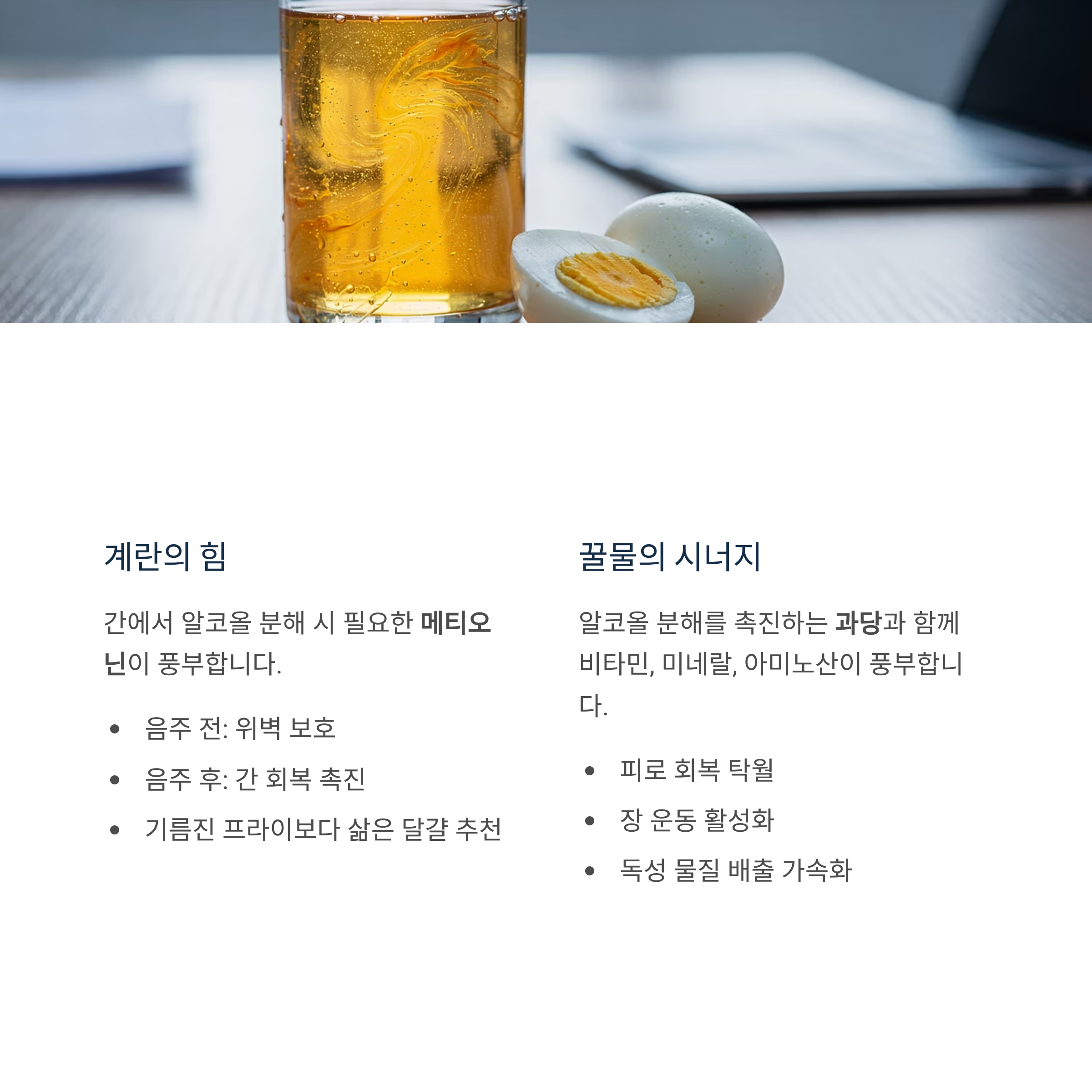 간에서 알코올 분해 시 필요한 메티오닌이 풍부합니다. 음주 전 섭취하면 위벽을 보호하고, 음주 후에는 간 회복을 도와 일석이조의 효과를 볼 수 있습니다. 기름진 계란 프라이보다는 삶은 달걀이 좋습니다.