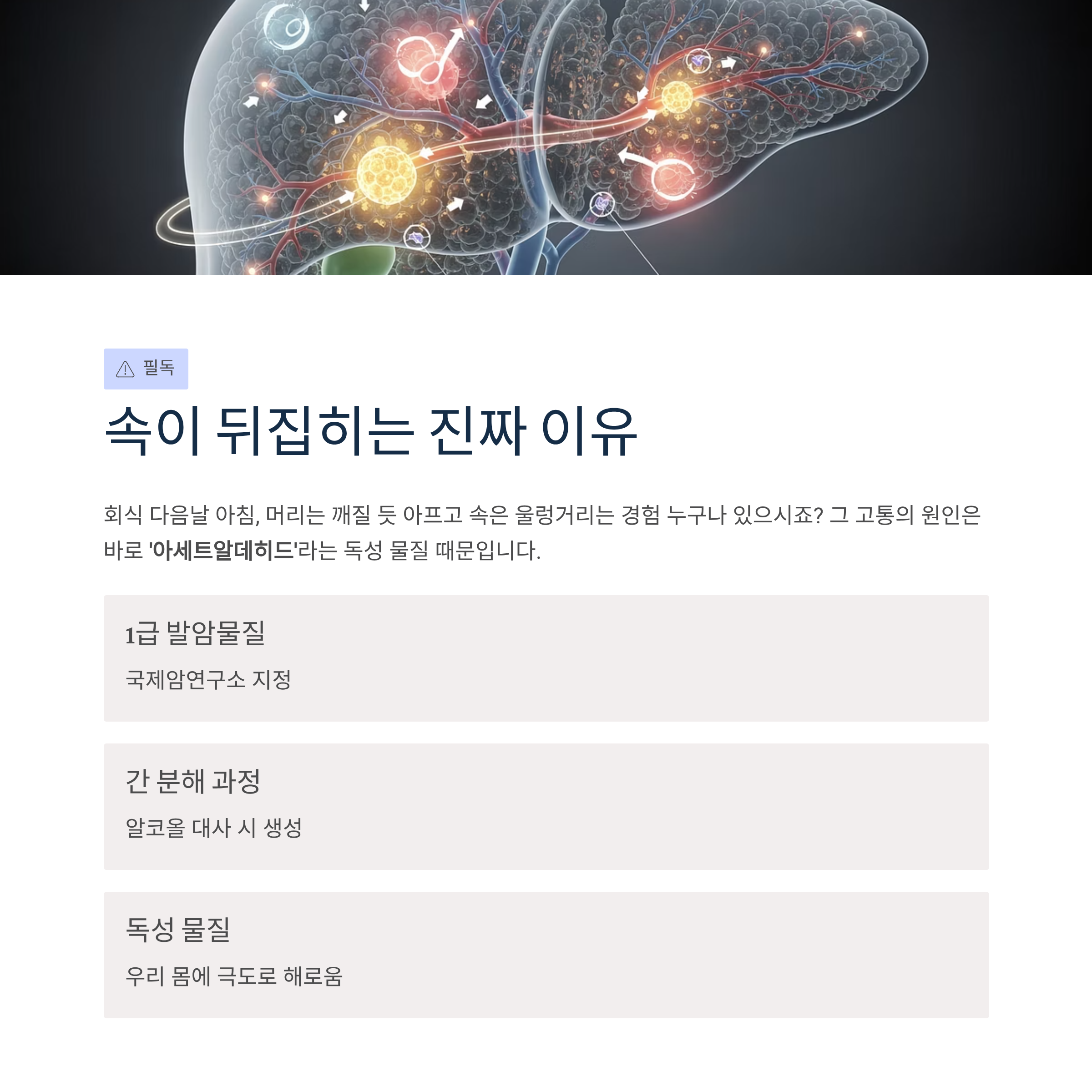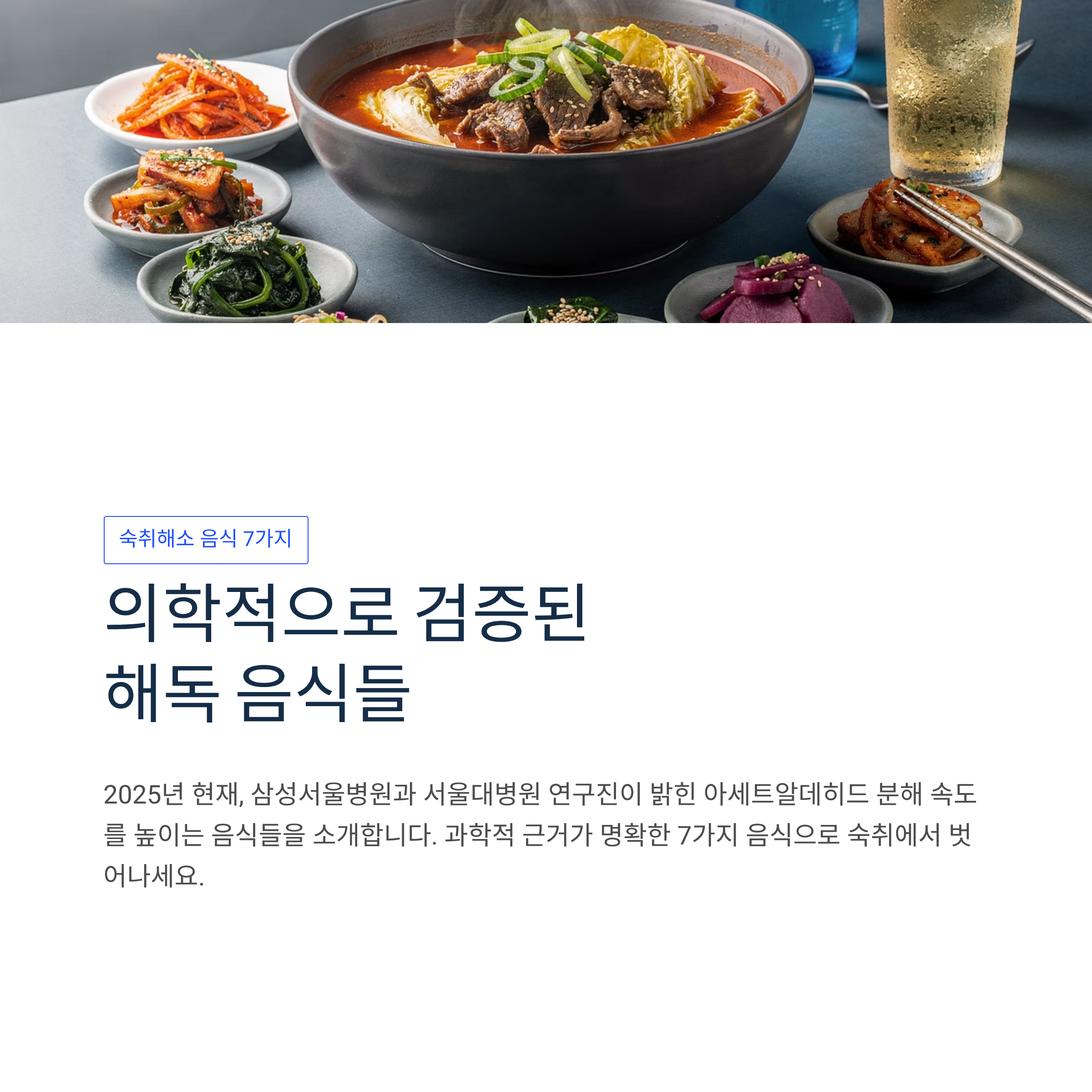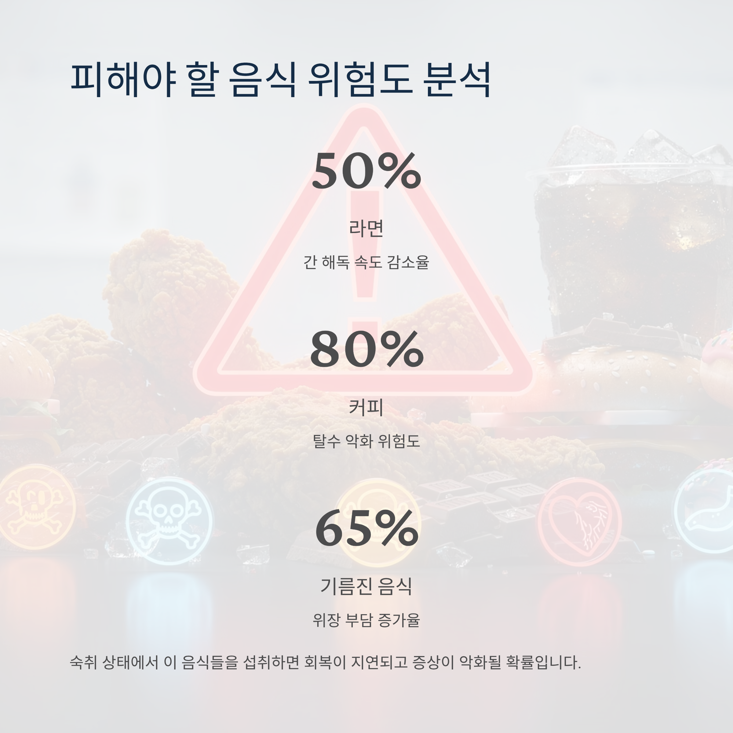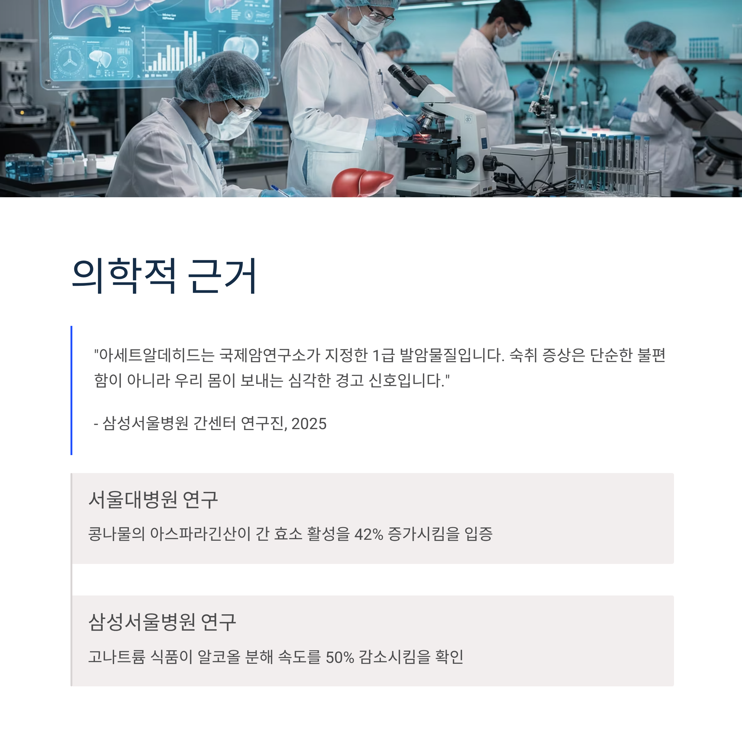 회식 다음날 아침, 머리는 깨질 듯 아프고 속은 울렁거리는 경험 누구나 있으시죠? 그 고통의 원인은 바로 '아세트알데히드'라는 독성 물질 때문입니다. 간에서 알코올을 분해하는 과정에서 생성되는 이 물질은 국제암연구소가 1급 발암물질로 분류할 만큼 우리 몸에 해로운데요. 2025년 현재, 삼성서울병원과 서울대병원 연구진이 밝힌 의학적으로 검증된 숙취해소 음식과 절대 피해야 할 음식을 정확히 알려드립니다.