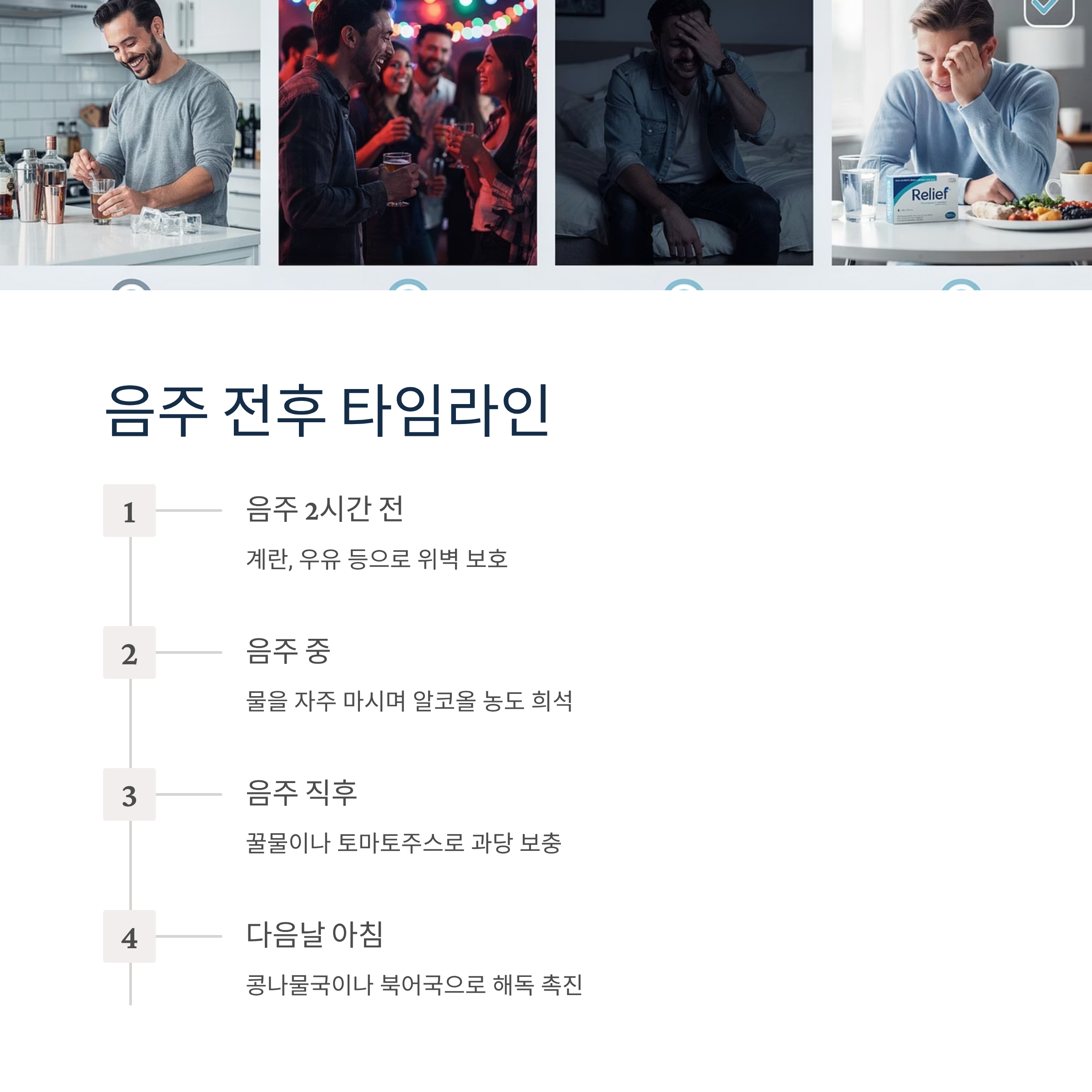 충분한 수분 섭취가 가장 중요합니다. 물이나 전해질 음료로 탈수를 예방하고, 충분한 휴식으로 간이 해독에 집중할 수 있도록 도와주세요. 비타민B 복합체는 알코올 분해를 촉진하니 음주 전후 섭취를 권장합니다.