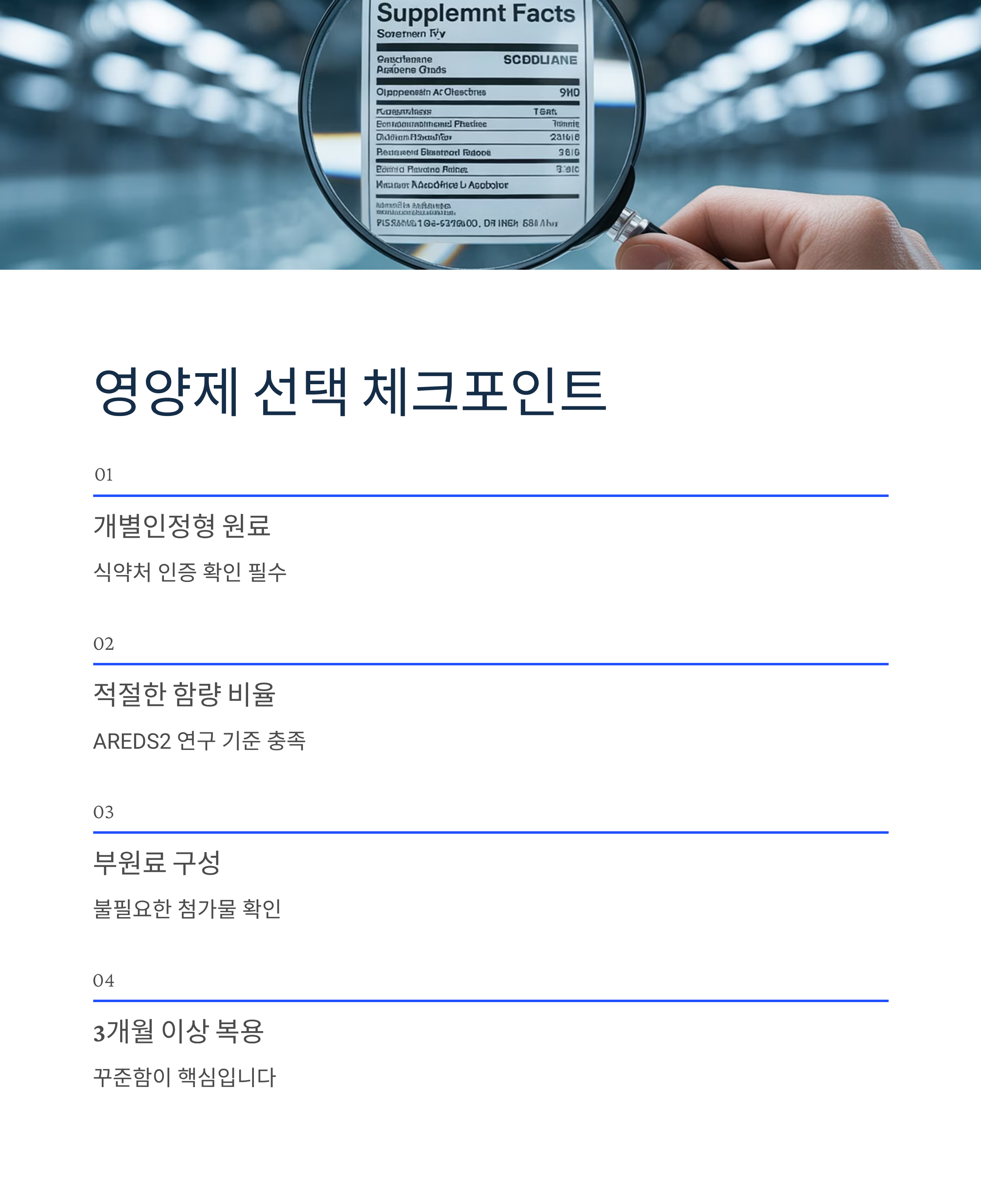 루테인과 지아잔틴은 3개월 이상 꾸준히 복용해야 효과를 볼 수 있습니다. 제품 선택 시 개별인정형 원료 사용 여부, 적절한 함량 비율, 부원료 구성을 꼼꼼히 확인하세요. 특히 AREDS2 연구 기준을 충족하는 루테인 10mg, 지아잔틴 2mg 함량을 기준으로 선택하는 것이 좋습니다.