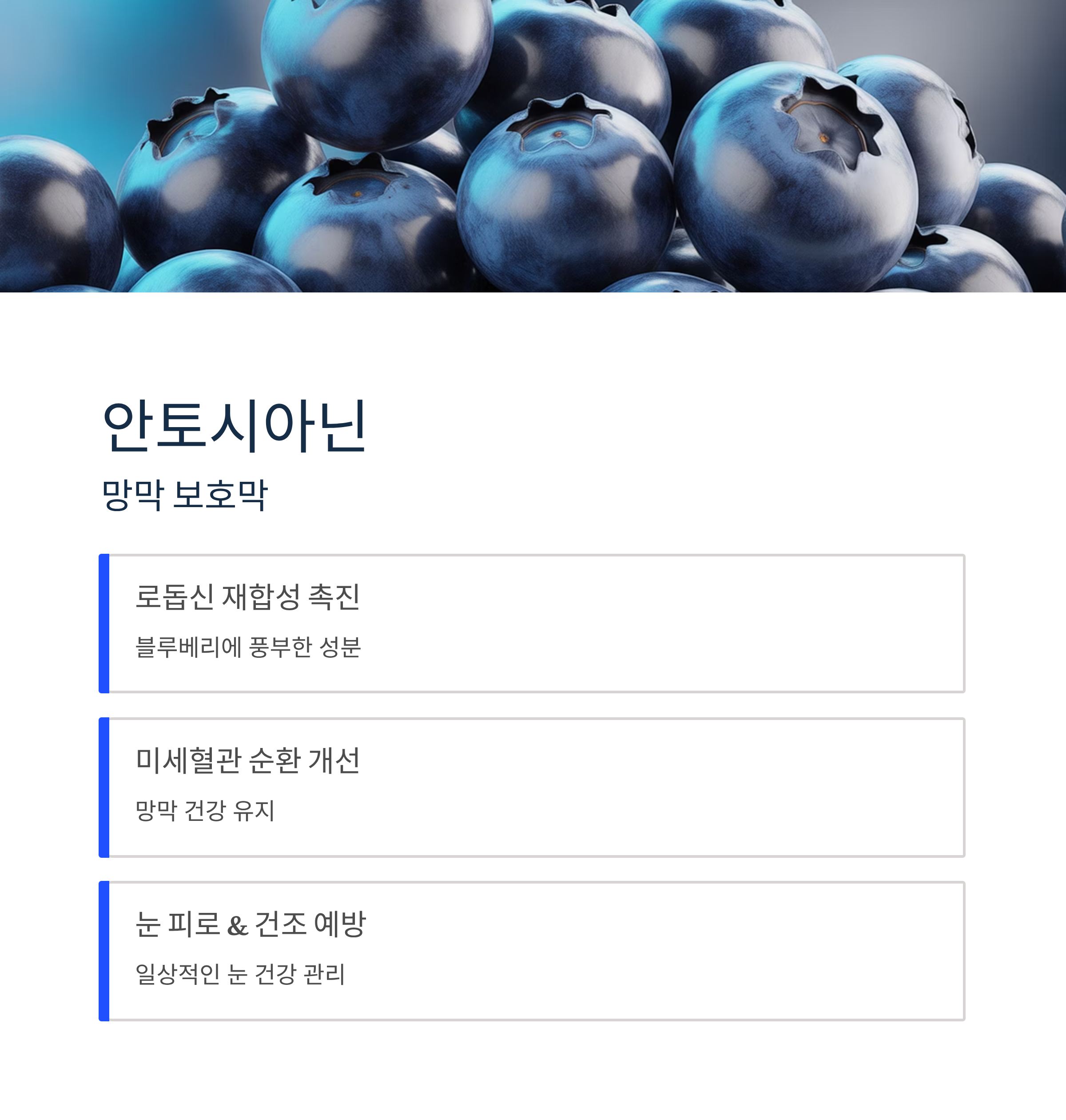 블루베리에 풍부한 안토시아닌은 로돕신 재합성을 촉진하고 망막 미세혈관 순환을 개선하여 눈 피로와 안구건조 예방에 도움을 줍니다.