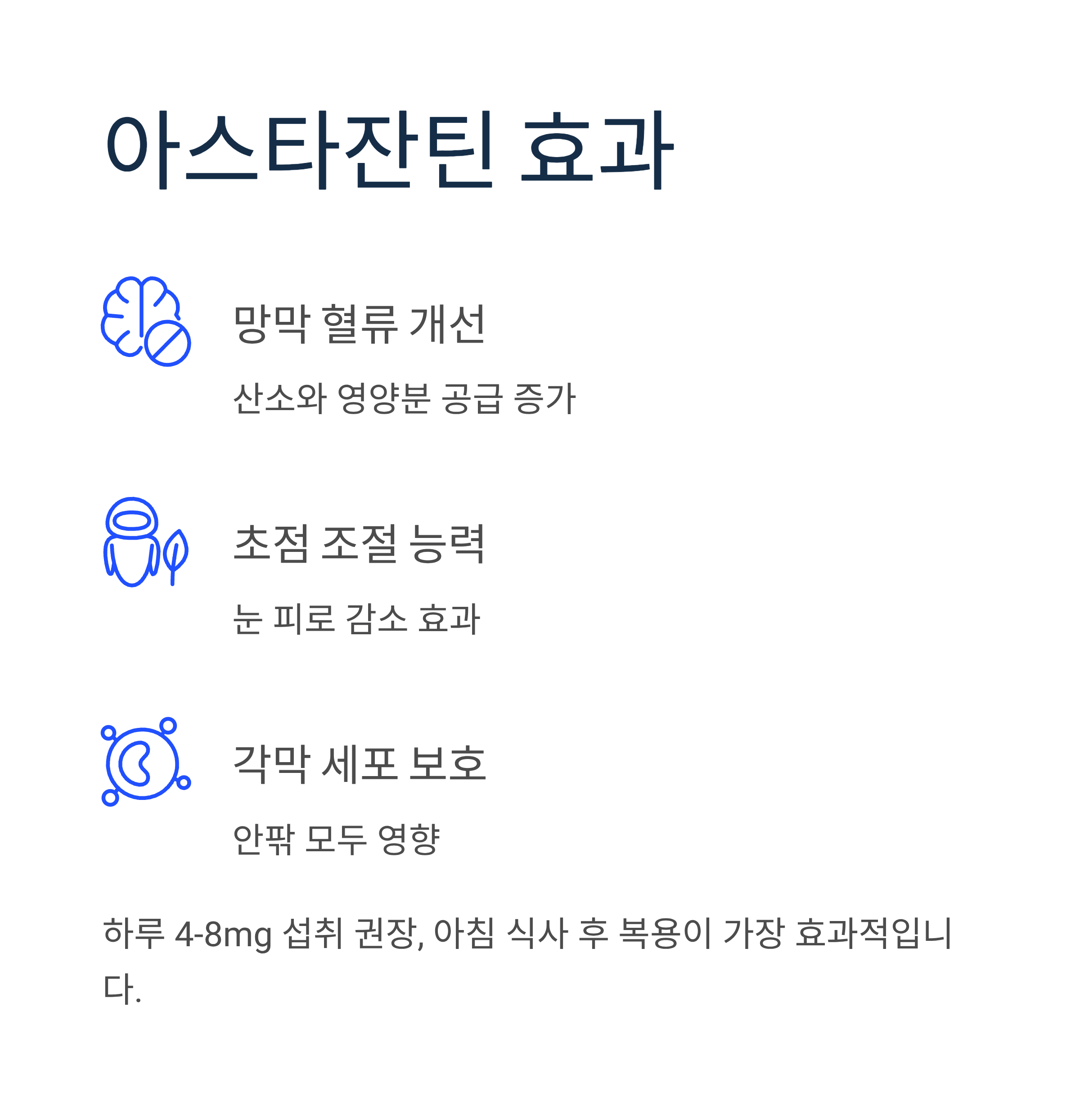 아스타잔틴은 비타민C보다 6,000배, 비타민E보다 550배 강력한 항산화 효과를 자랑합니다. 망막 혈류를 개선하고 각막 세포 안팎 모두에 영향을 주어 눈 피로 감소와 초점 조절 능력 개선에 탁월합니다. 하루 4-8mg 섭취가 권장되며 아침 식사 후 복용이 효과적입니다.