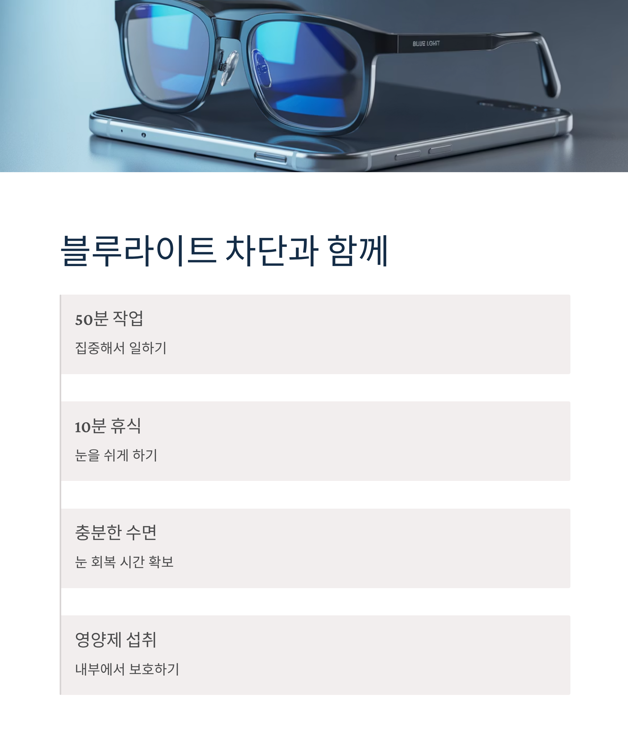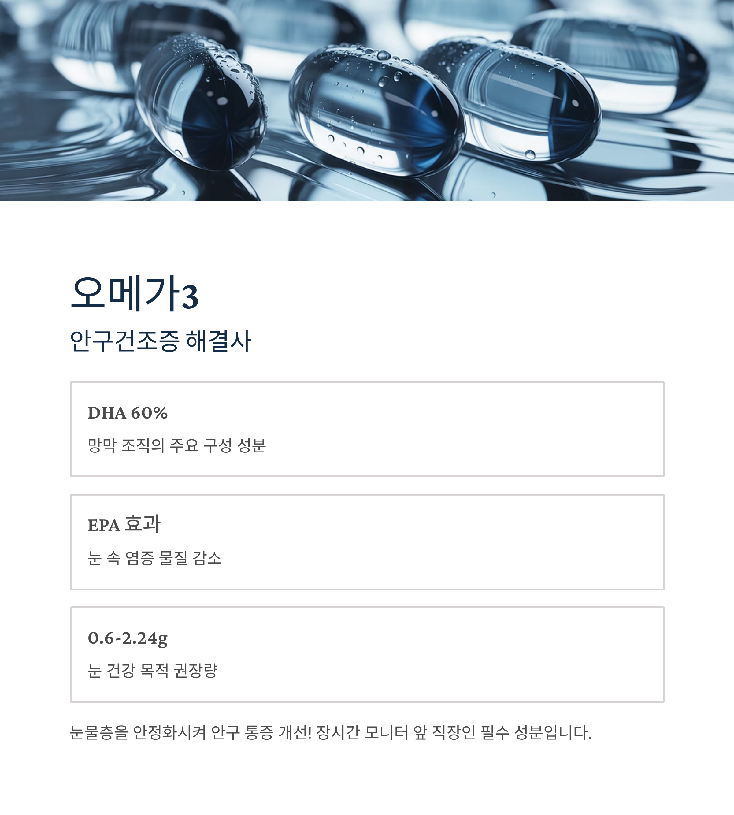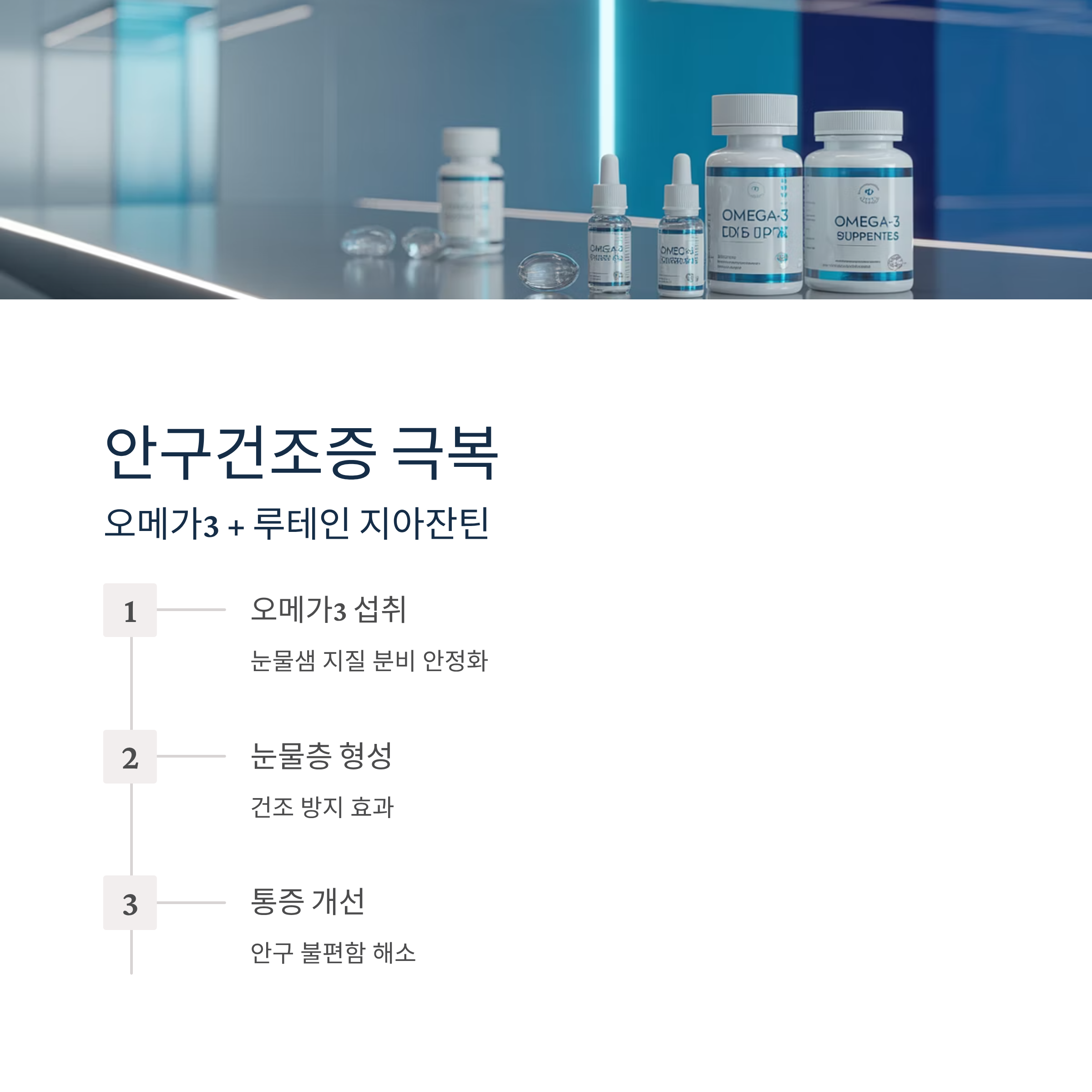 오메가3와 루테인 지아잔틴 복합 섭취가 효과적입니다. 오메가3가 눈물샘의 지질 분비를 안정화하고 건조를 방지합니다.