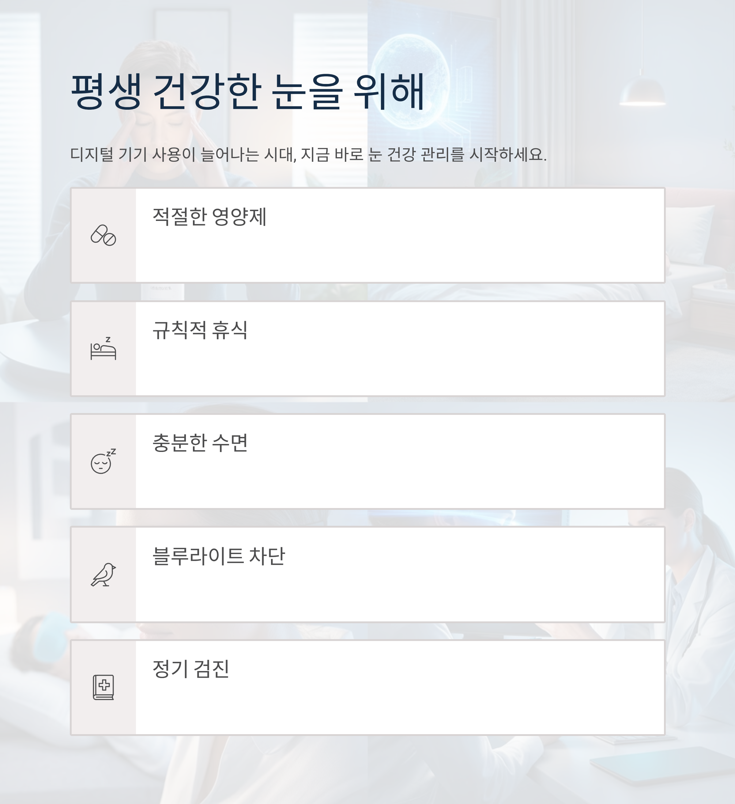 눈 건강은 하루아침에 만들어지지 않습니다. 디지털 기기에서 발생하는 블루라이트 차단과 함께 적절한 영양제 섭취로 소중한 시력을 지키세요. 50분 작업 후 10분 휴식, 충분한 수면과 더불어 자신의 눈 상태에 맞는 영양제를 선택한다면 평생 건강한 눈을 유지할 수 있습니다.