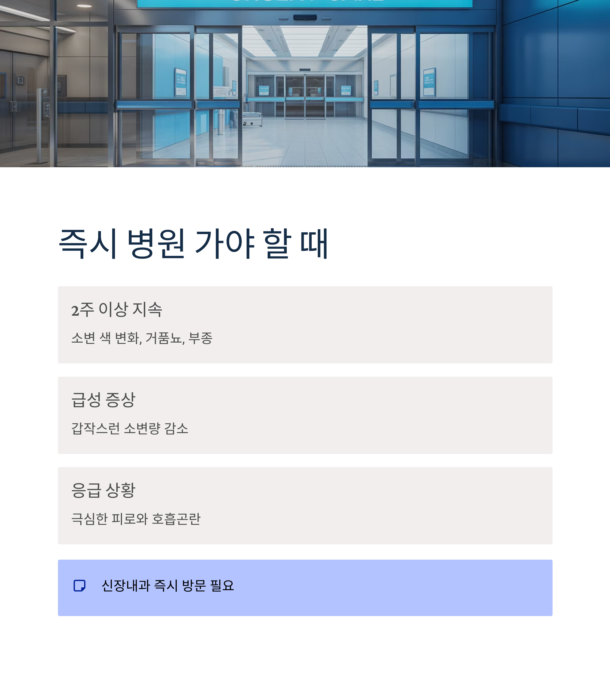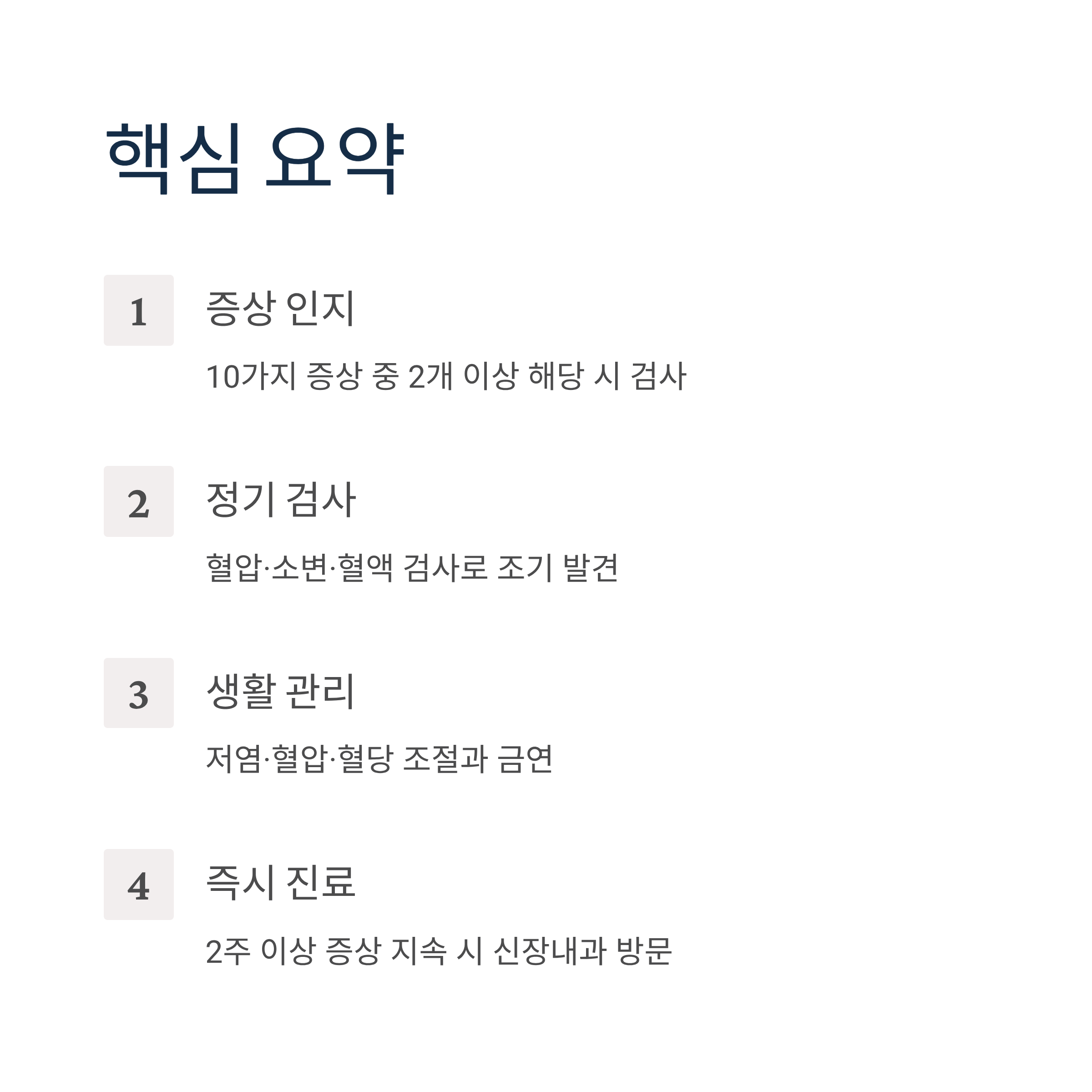 본 글은 일반적인 의학 정보 제공을 목적으로 하며, 개인의 건강 상태나 질병 진단을 대체할 수 없습니다. 신장 기능 저하 의심 증상이 있다면 반드시 신장내과 전문의의 정확한 진단과 치료를 받으시기 바랍니다.