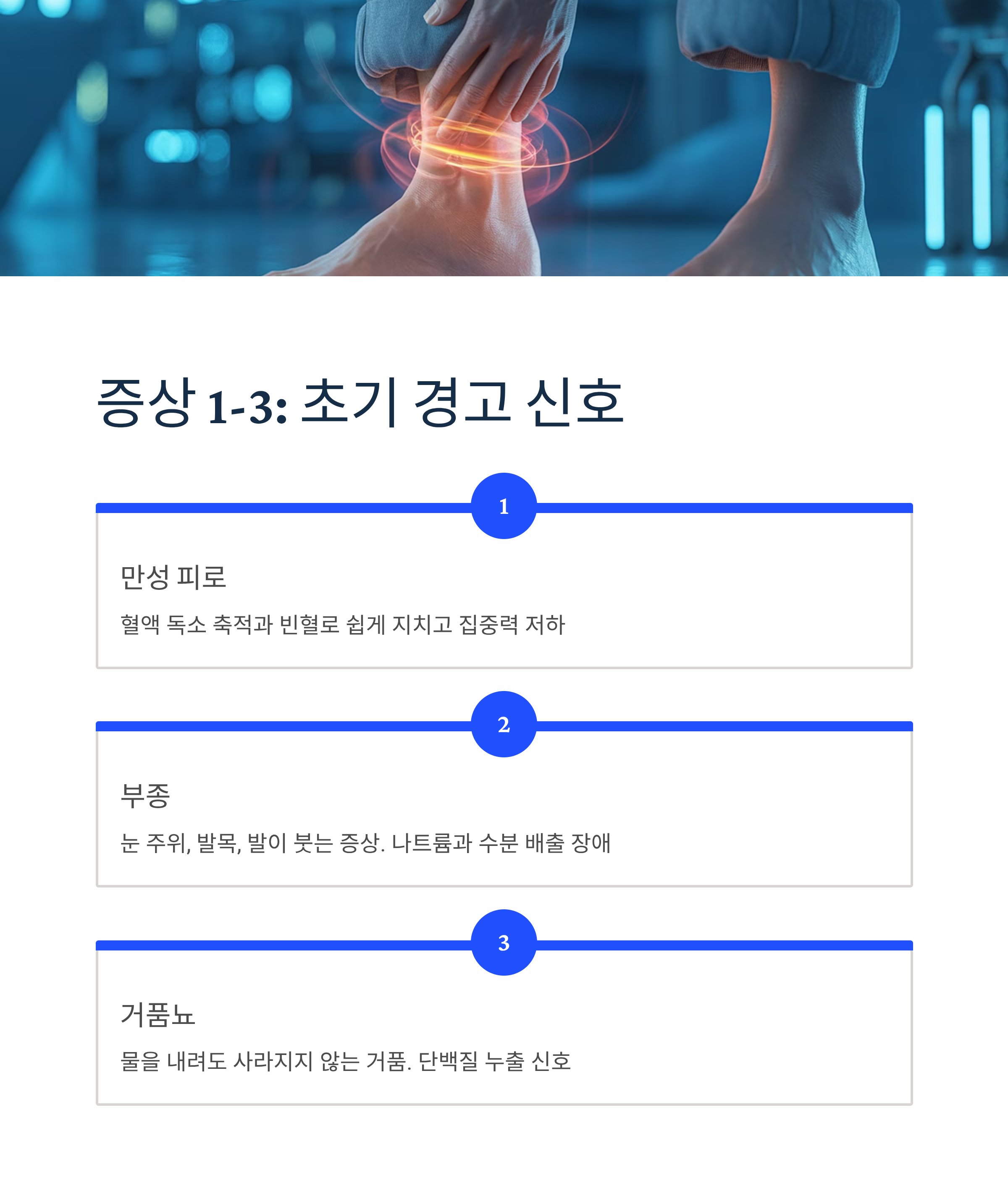 갑자기 이유 없이 피곤하고 발목이 자주 붓는다면, 단순한 피로가 아닐 수 있습니다. '침묵의 장기'라 불리는 신장은 기능이 상당히 저하될 때까지 뚜렷한 증상을 보이지 않아, 환자의 90%가 심각한 단계에 도달해서야 문제를 알아차립니다. 2024년 대한신장학회 자료에 따르면 35세 이상 성인 6명 중 1명이 만성 콩팥병 환자이며, 조기 발견만으로도 말기 신부전으로의 진행을 막을 수 있습니다.