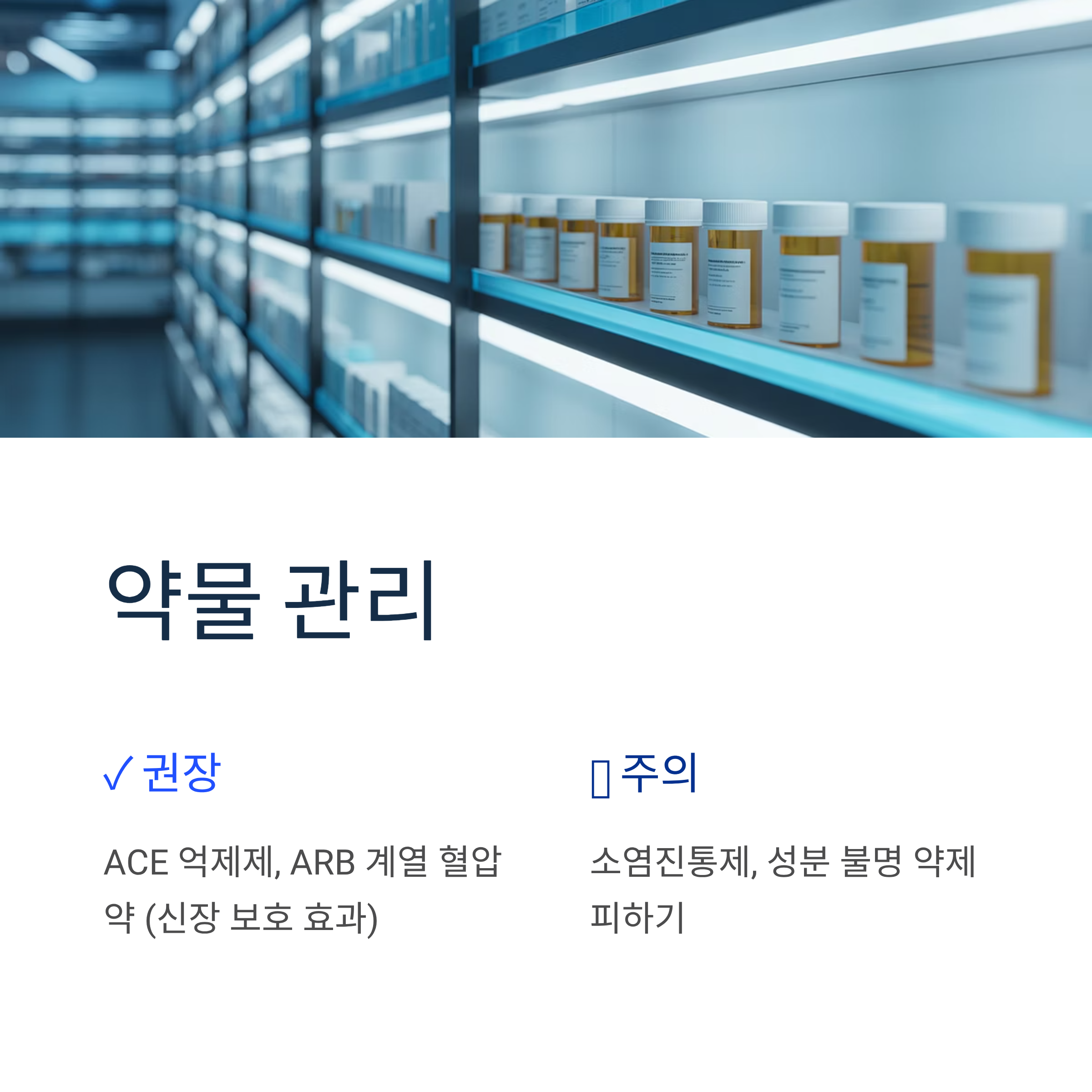 - 신장 보호 약물: ACE 억제제나 ARB 같은 혈압약이 도움이 됩니다