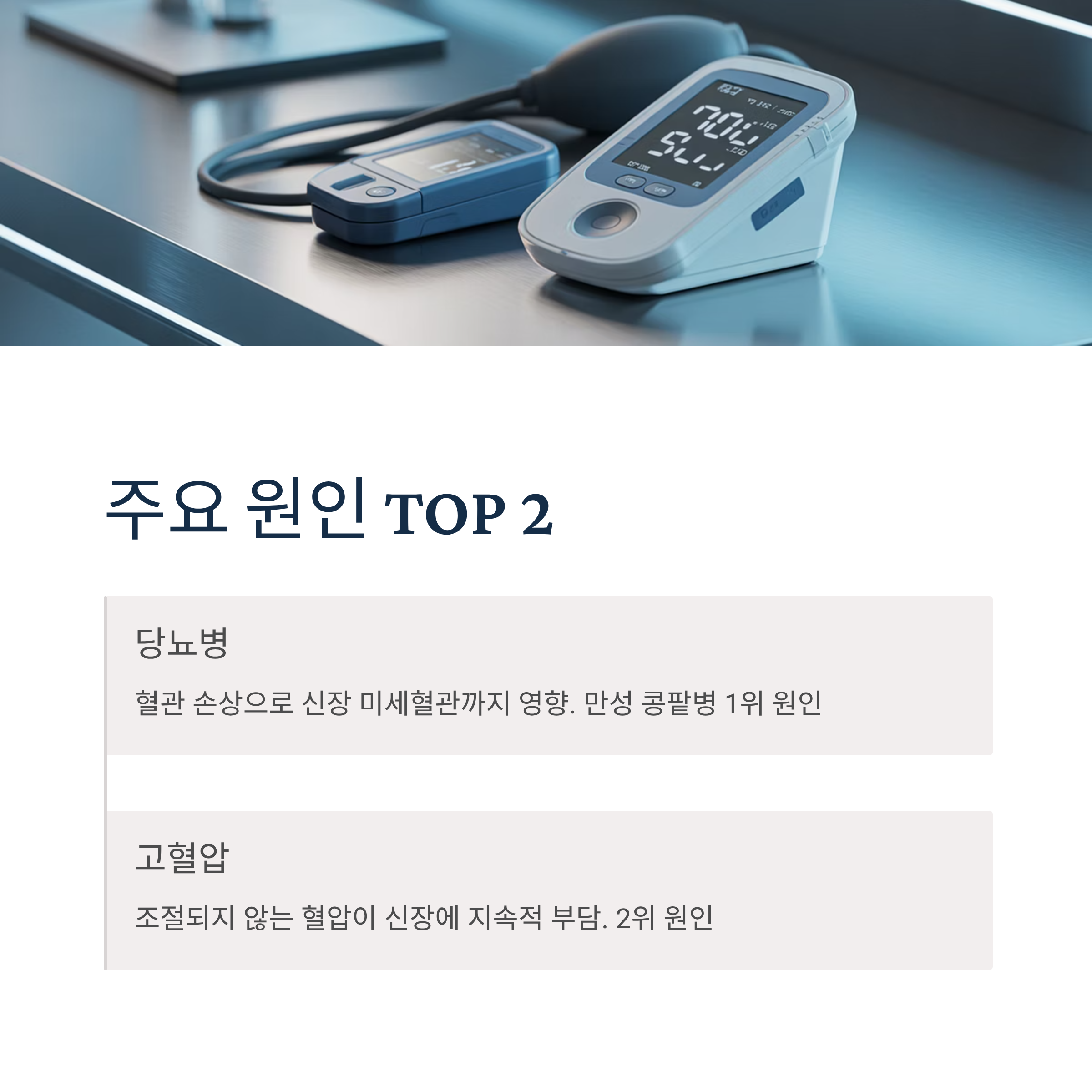 만성 콩팥병을 일으키는 가장 흔한 원인은 당뇨병과 고혈압입니다. 당뇨병은 혈관을 손상시켜 신장의 미세 혈관까지 영향을 미치며, 조절되지 않는 고혈압은 신장에 지속적인 부담을 줍니다. 이 외에도 사구체 신염, 다낭성 신장 질환, 장기간 진통제 복용, 자가면역 질환, 머리 외상 등이 신장 기능 저하를 유발할 수 있습니다. 특히 고령, 가족력, 흡연, 비만은 만성 콩팥병의 위험을 높이는 요인입니다.