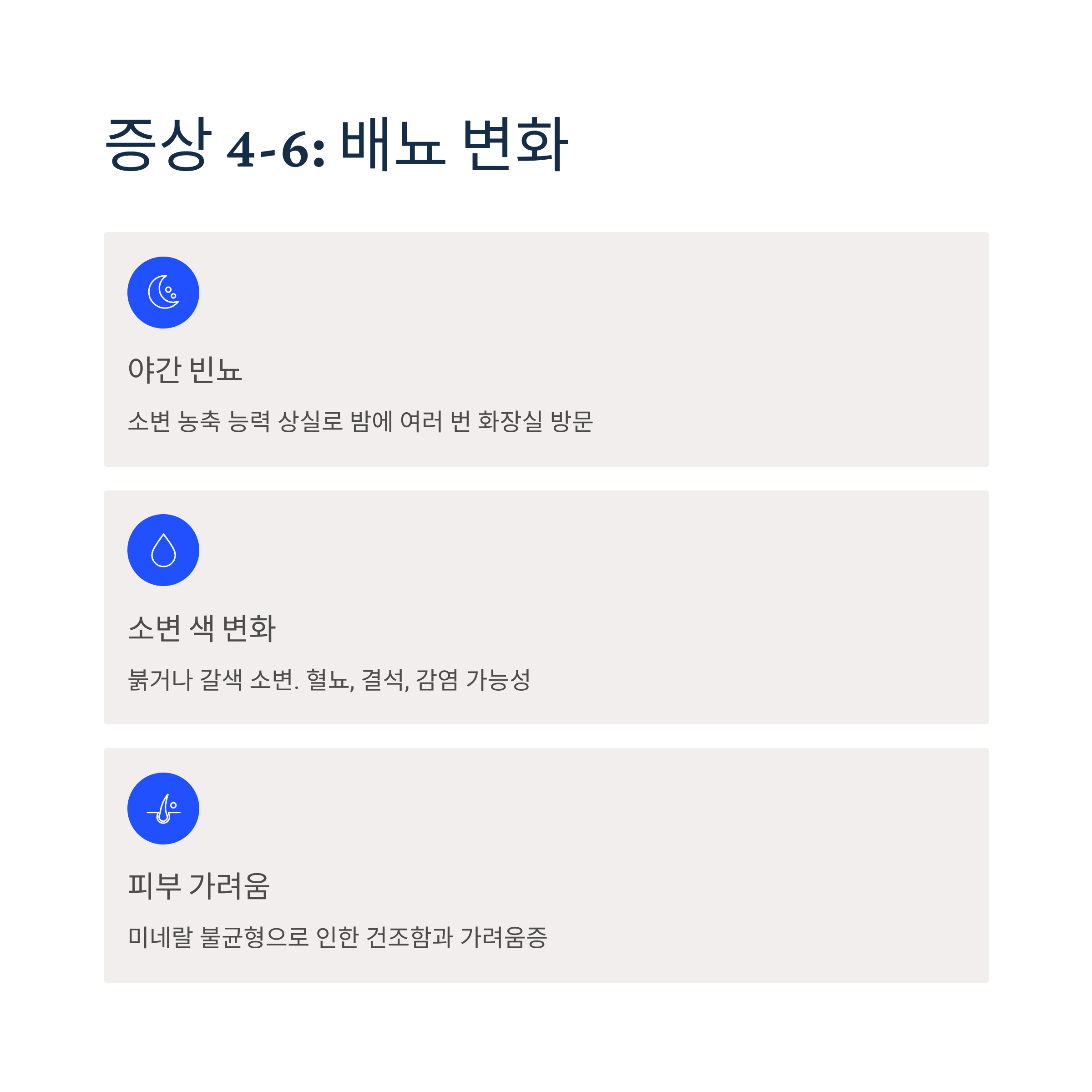 신장이 소변을 농축하는 능력을 잃으면서 밤에 여러 번 깨서 화장실을 가게 됩니다.