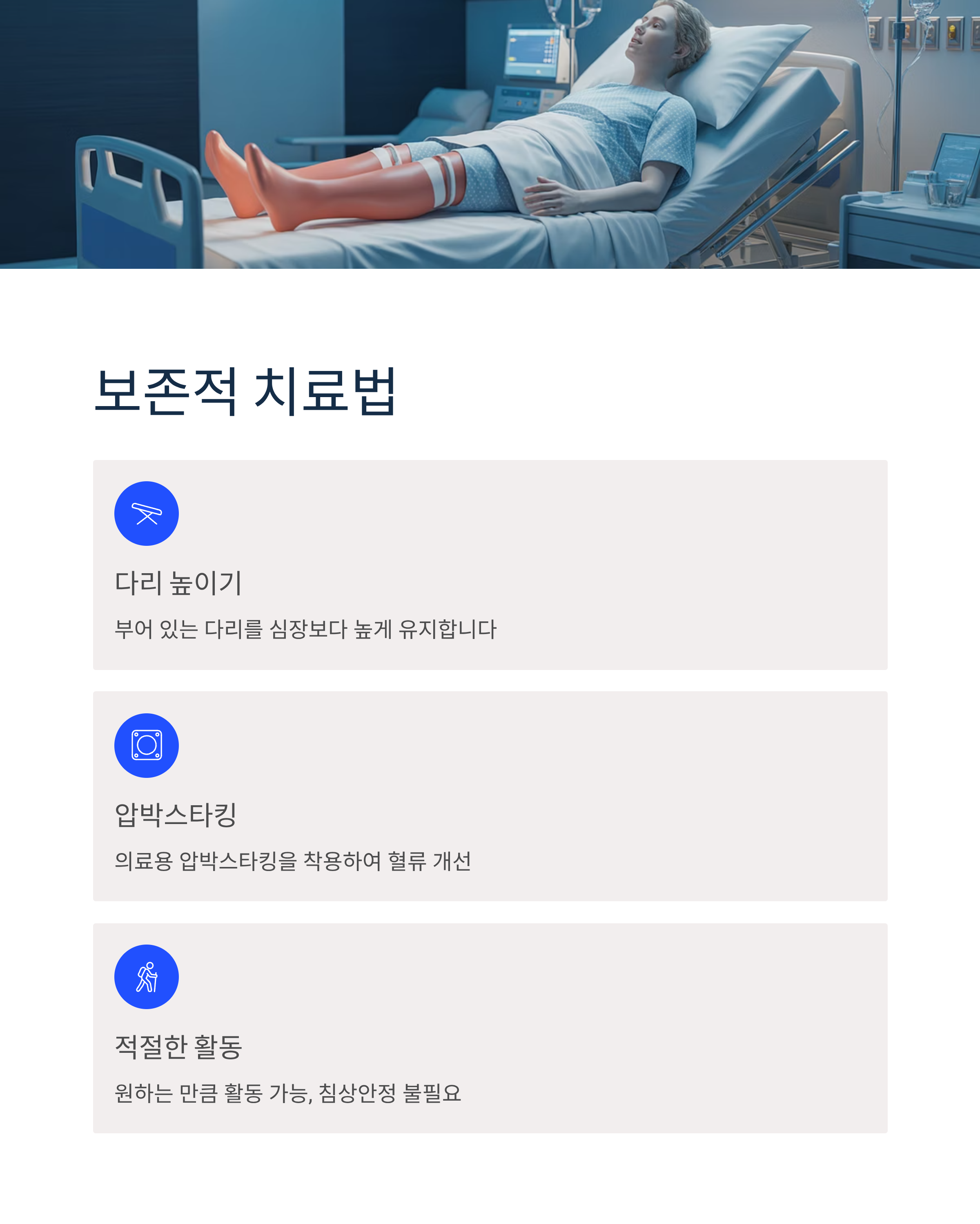 침상안정은 필요치 않지만 증상 완화에 도움은 됩니다. 환자들은 원하는 만큼 활동할 수 있습니다. 신체 활동은 혈전이 떨어져 나와 폐색전증을 일으킬 위험을 증가시키지 않습니다.