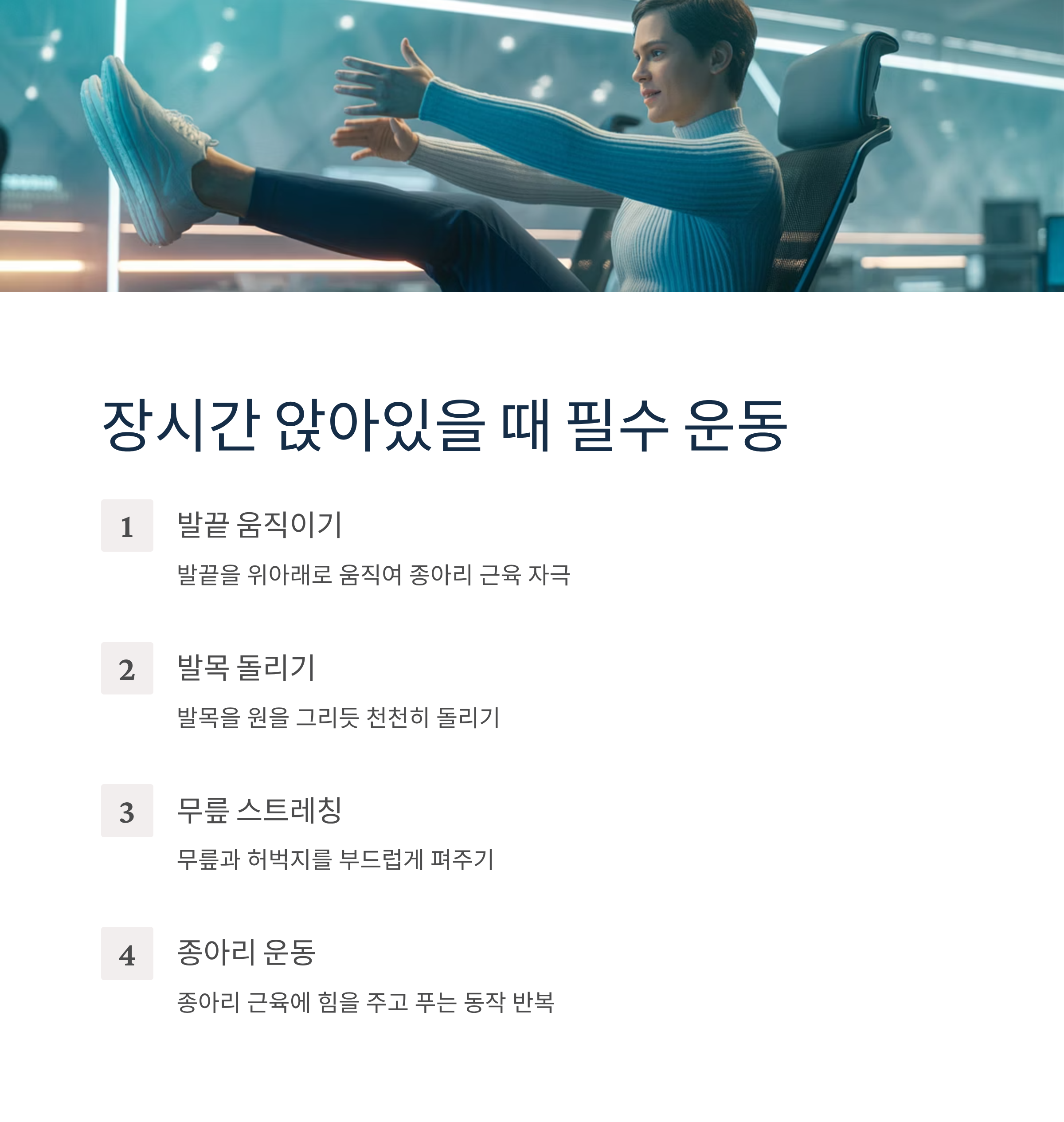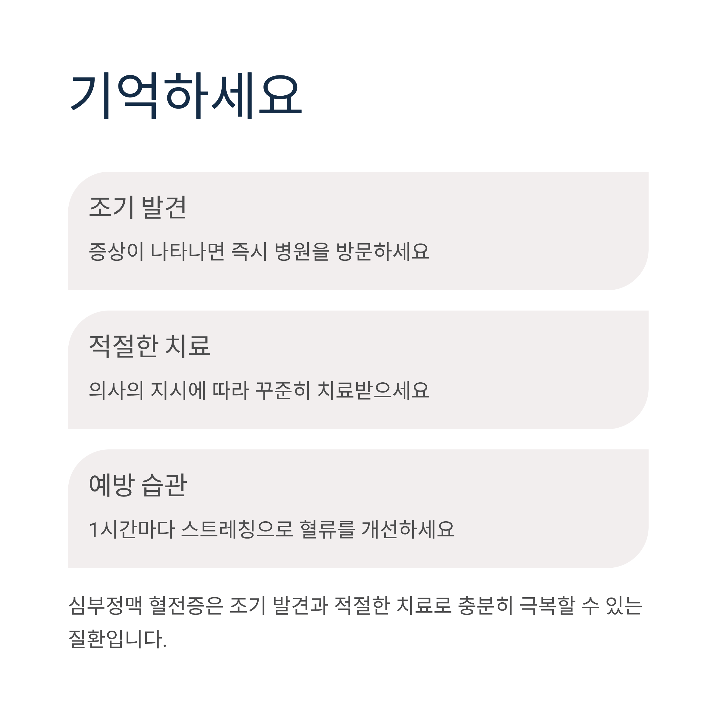 장시간 앉아 있어야 하는 상황이라면 반드시 1시간마다 일어나서 간단한 스트레칭을 하세요. 심부정맥 혈전증은 조기 발견과 적절한 치료로 충분히 극복할 수 있는 질환입니다.