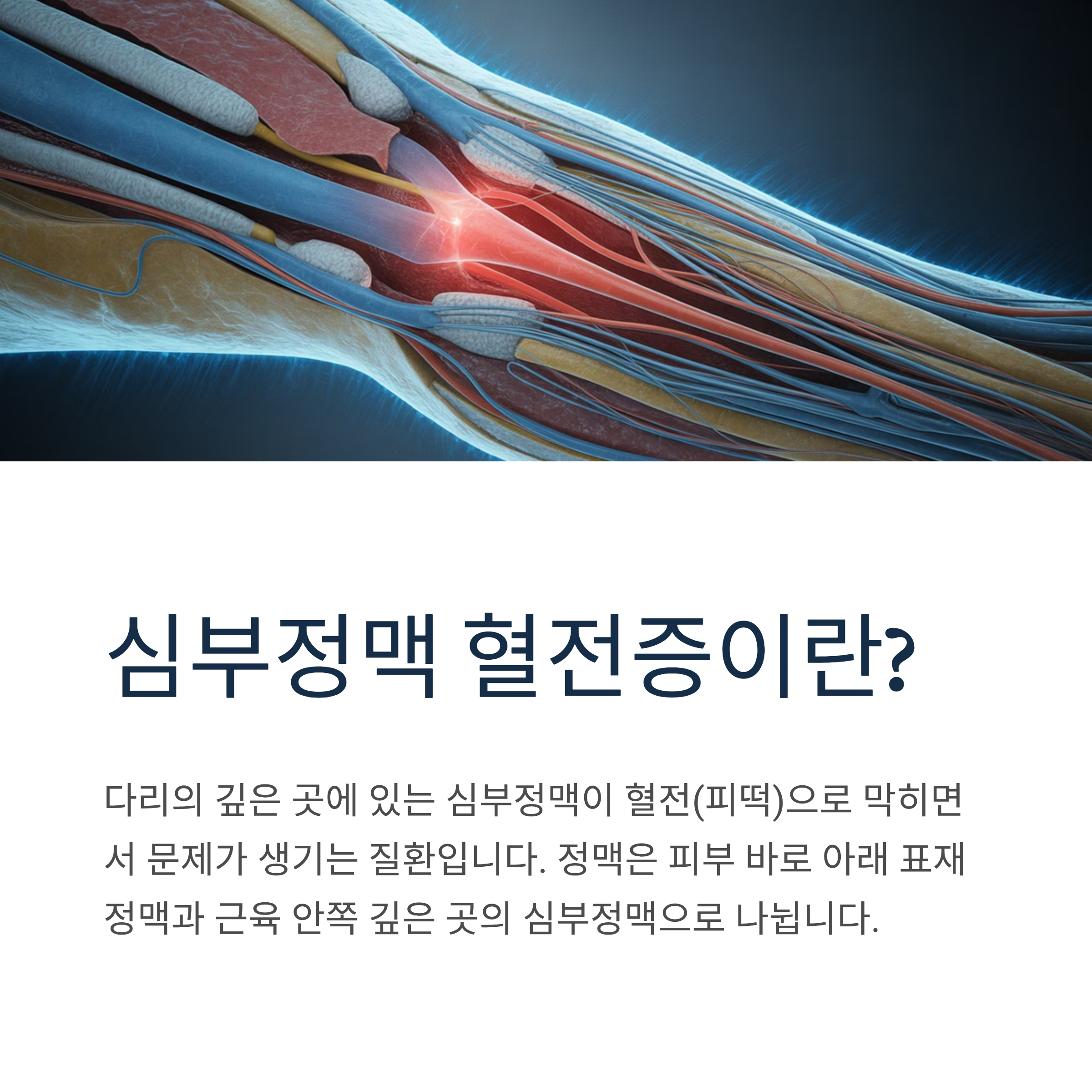 심부정맥혈전증은 주로 다리의 심부정맥이 혈전으로 막히면서 문제가 생기는 질환으로, 정맥은 피부 바로 아래에 있는 표재정맥과 근육 안쪽 깊은 곳에 있는 심부정맥으로 나눌 수 있는데, 심부정맥이 혈전(피떡)으로 막히면서 문제가 생기는 질환입니다.