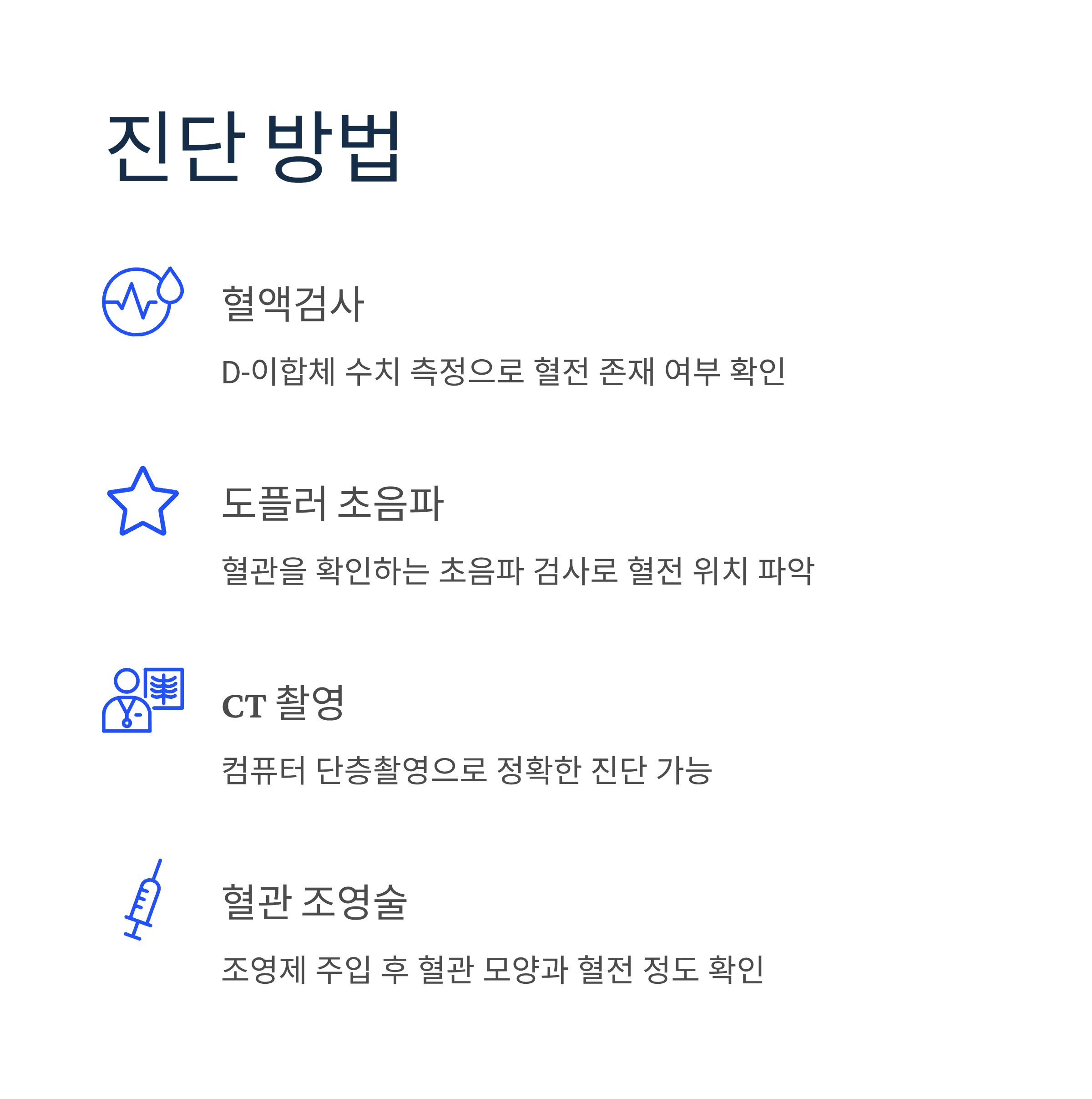 혈전증이 잘 생길 수 있는 상황에 처한 환자에게 하지 증상이 있는 경우, 임상적으로 진단할 수 있으며, 정맥 도플러 초음파 검사나 컴퓨터 단층촬영(CT)을 통해 확진할 수 있습니다.