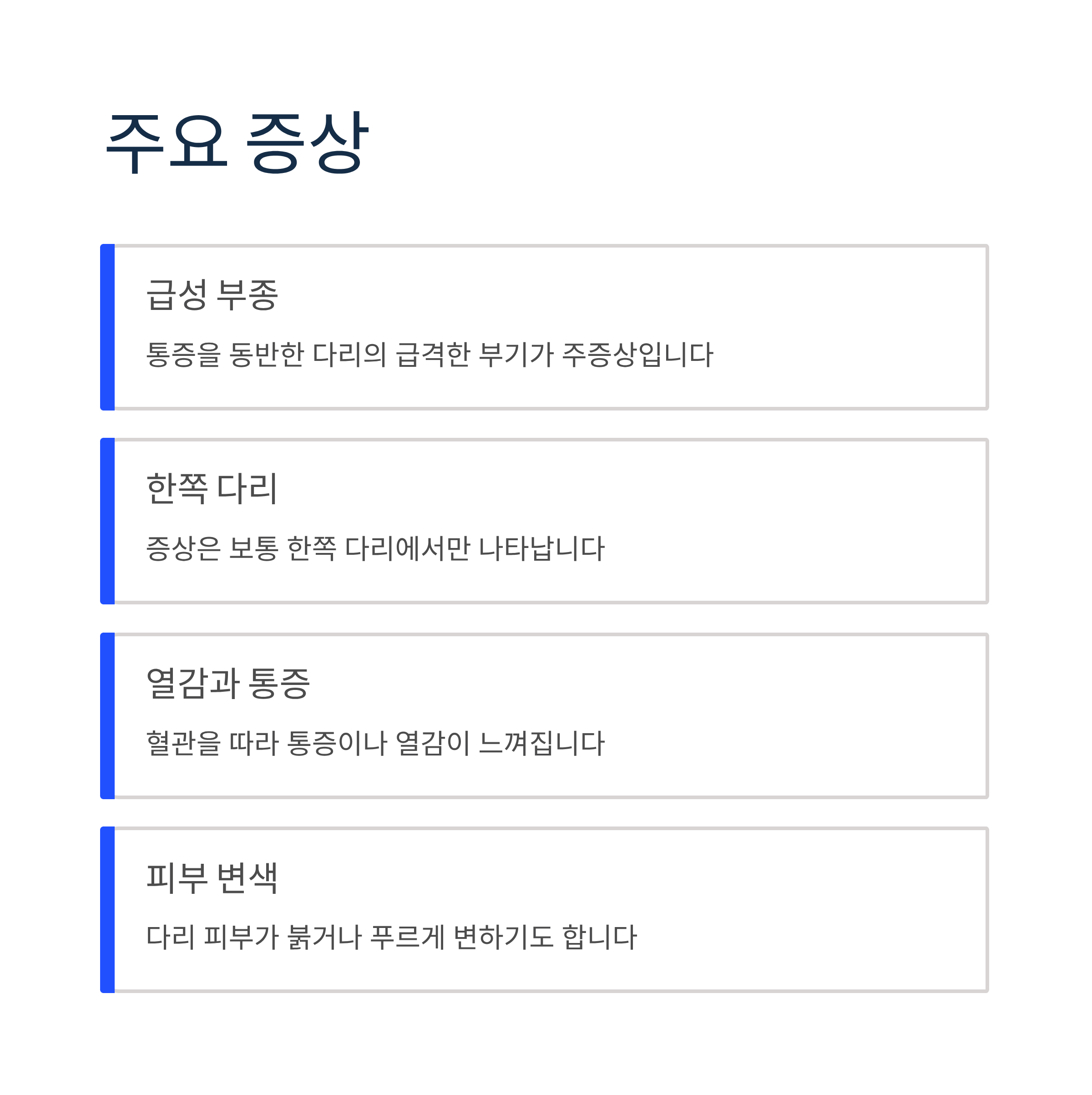 심부정맥혈전증의 증상은 막힌 심부정맥의 위치 및 범위에 따라 다양하게 나타날 수 있으나 주로 다리에 많이 발생하므로 대부분 통증을 동반한 다리의 급성 부종이 주증상으로 나타납니다. 정맥이 막힌 부위의 아래 부분 다리가 딴딴하게 부풀어 오르고 통증을 동반하게 됩니다.
