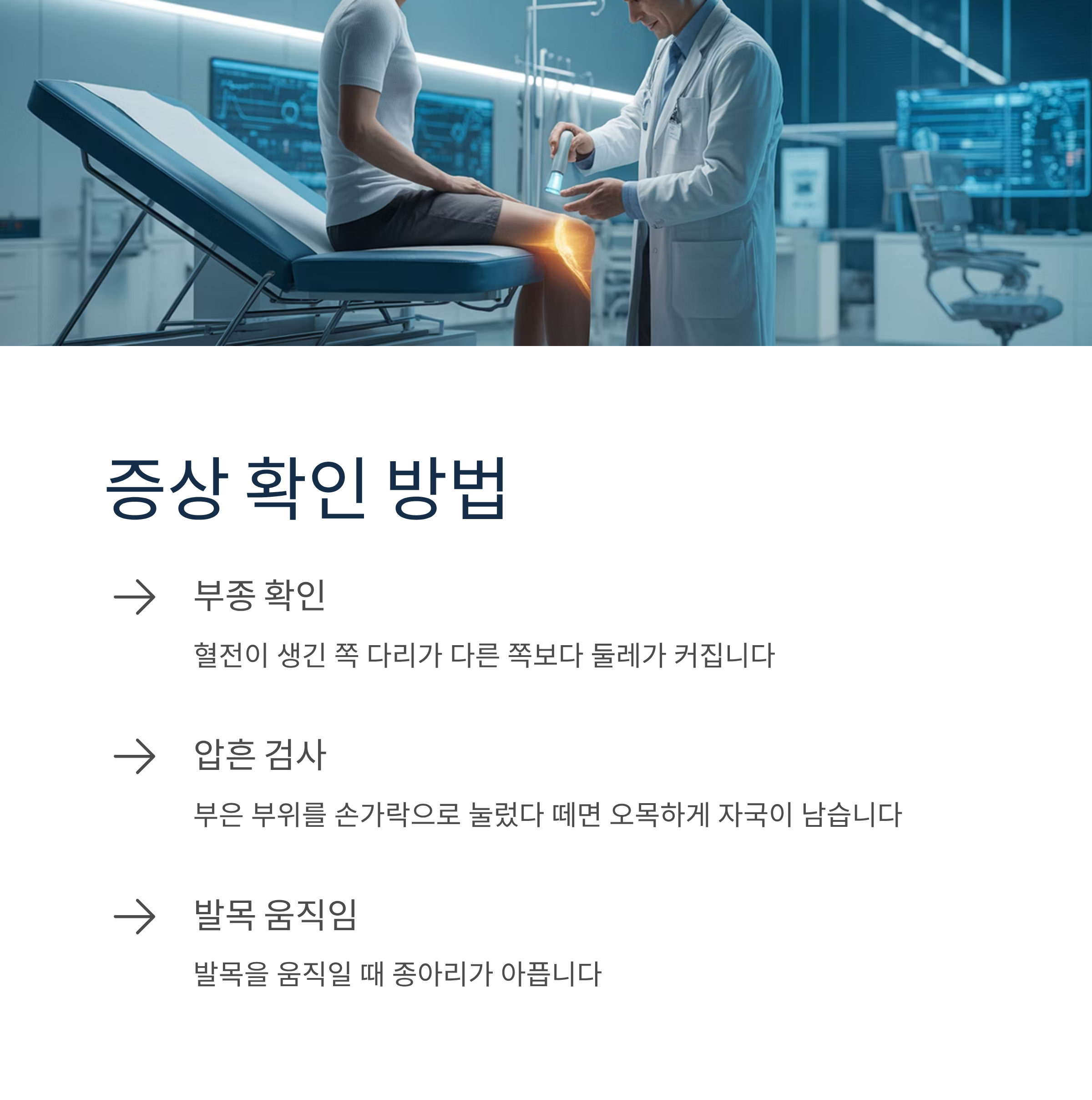 증상은 보통 한쪽 다리에서만 나타납니다. 혈관을 따라서 통증이나 열감이 느껴지고 발목을 움직일 때 종아리가 아프기도 합니다. 혈전이 생긴 쪽 다리가 붓기 시작하면서 다른 쪽 다리보다 둘레가 커지고, 부은 부위를 손가락으로 눌렀다 떼면 오목하게 자국이 남고, 다리 피부가 붉거나 푸르게 변하기도 합니다.