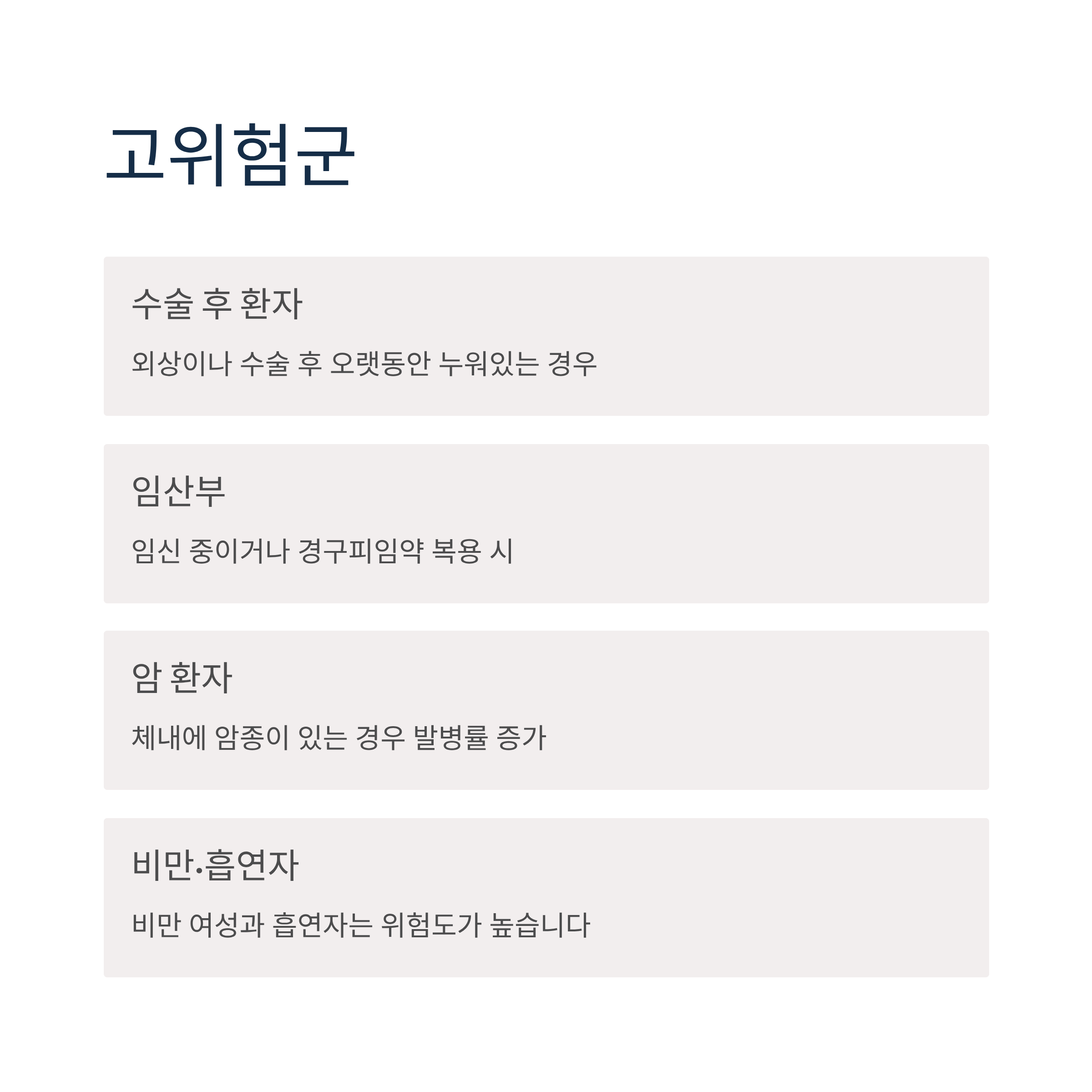 외상이나 수술 후, 임신, 혈전증 과거력이 있는 경우, 체내에 암종이 있는 경우, 비만 여성의 경우에 많이 발생합니다. 진성 다혈구혈증, 비장 적출술, 버거씨병, 궤양성 대장염 등 전신 질환에서 그 발병 빈도가 높은 것으로 알려져 있습니다.