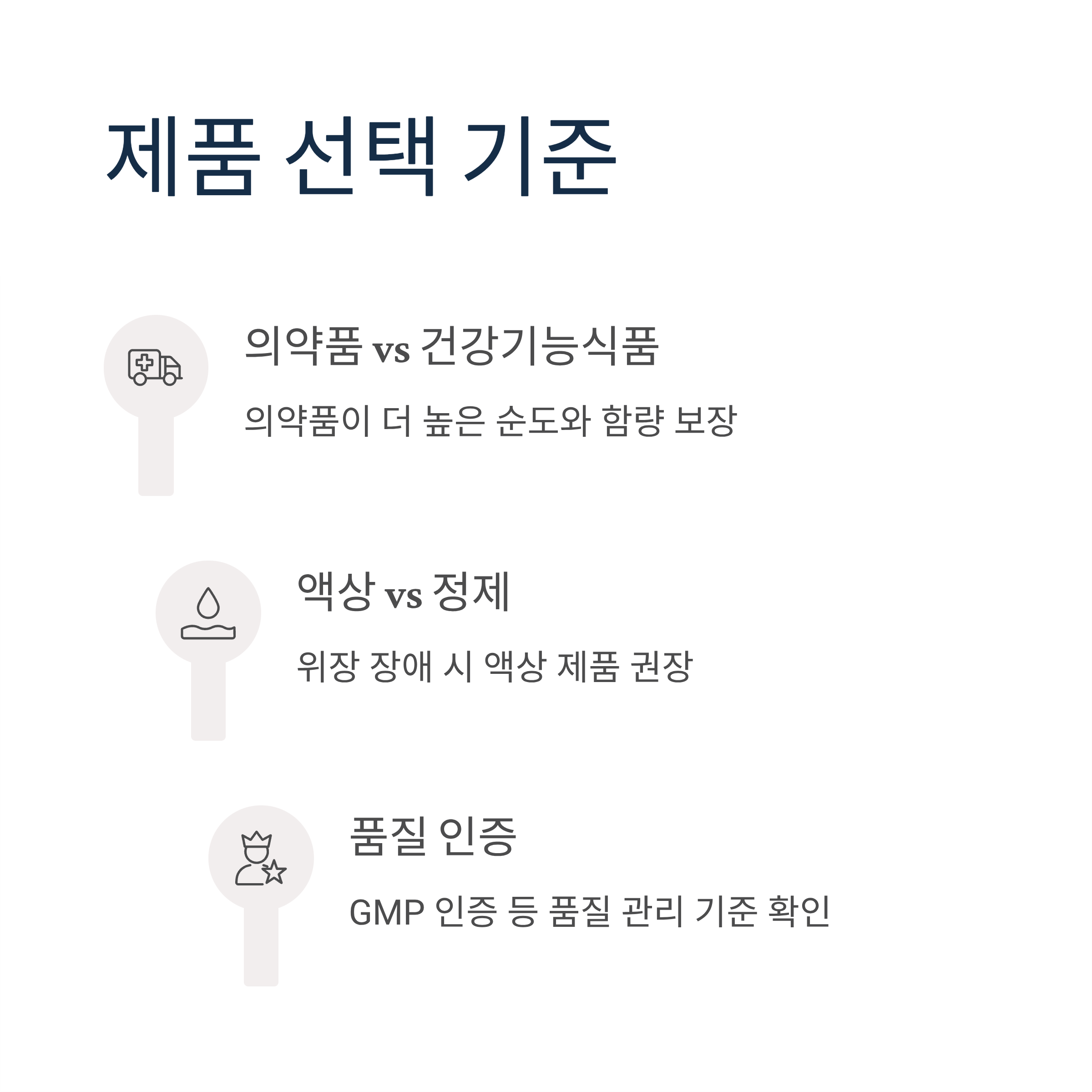 - 액상 vs 정제: 위장 장애가 있다면 액상 제품이 더 적합