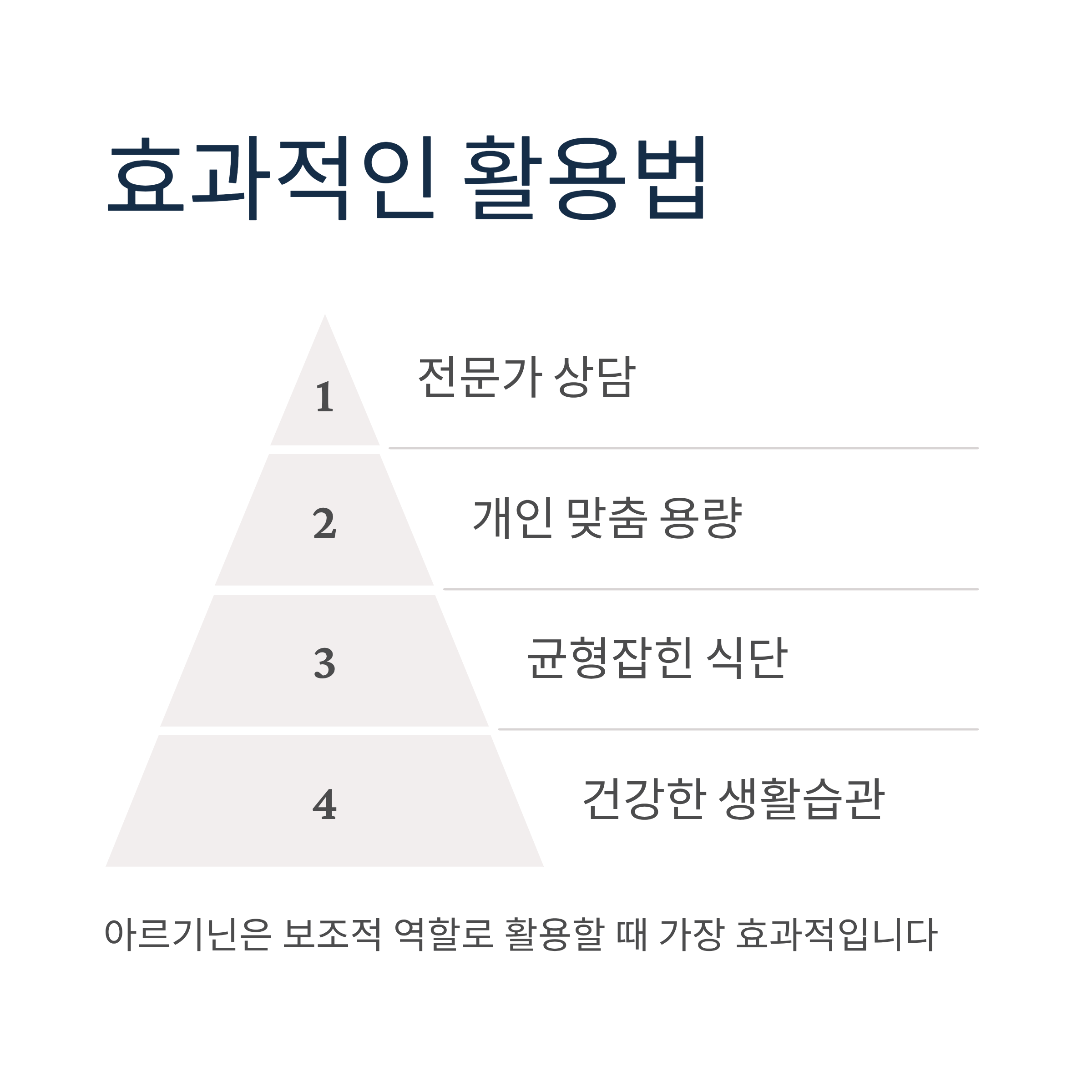아르기닌은 혈액순환 개선, 운동 성능 향상, 피로 회복 등 다양한 효능을 가진 유용한 영양소입니다. 하지만 개인의 건강 상태와 복용 목적에 따라 적절한 용량과 방법이 달라질 수 있습니다.