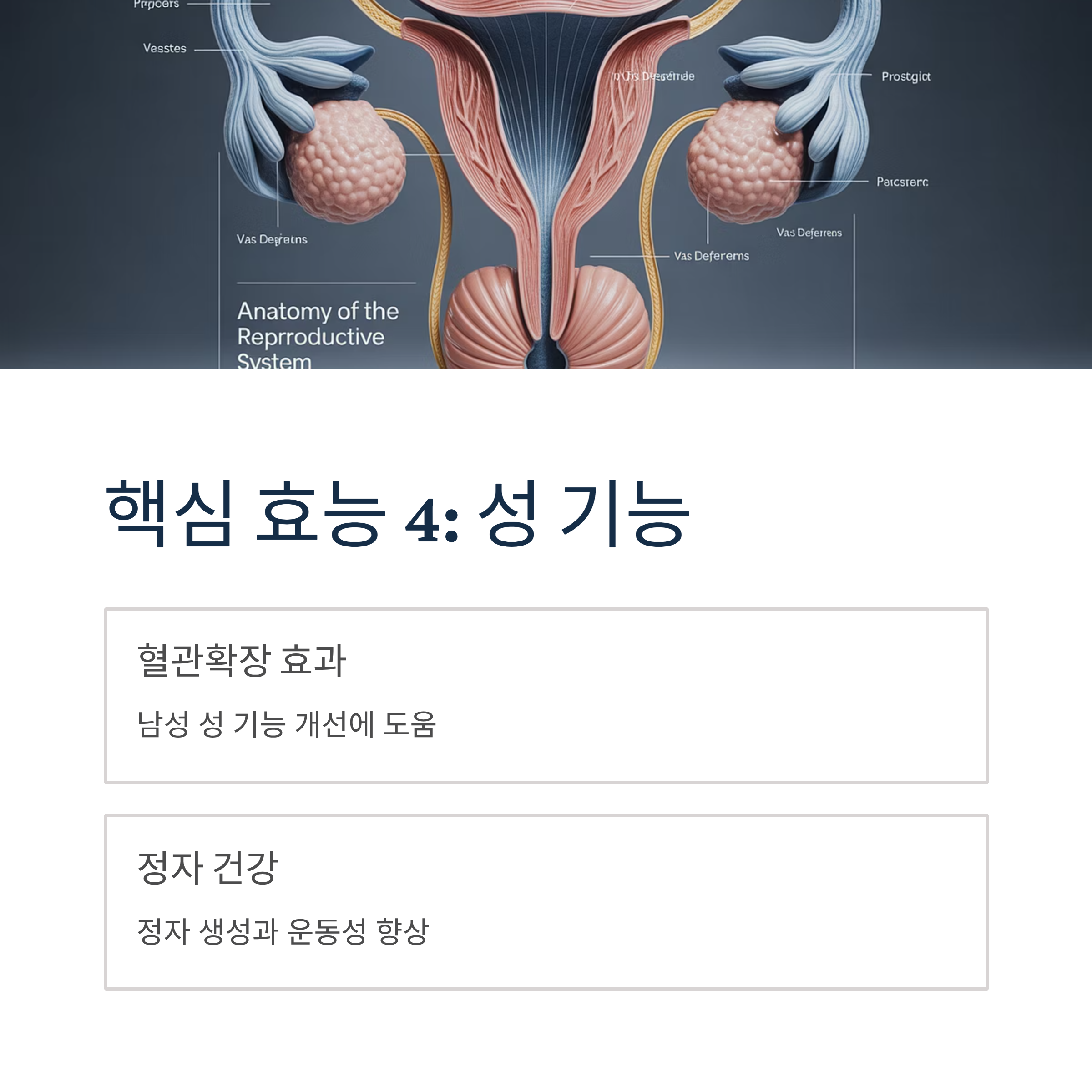 혈관확장 효과로 남성 성 기능 개선과 정자 생성 및 운동성 향상에 도움을 줍니다.