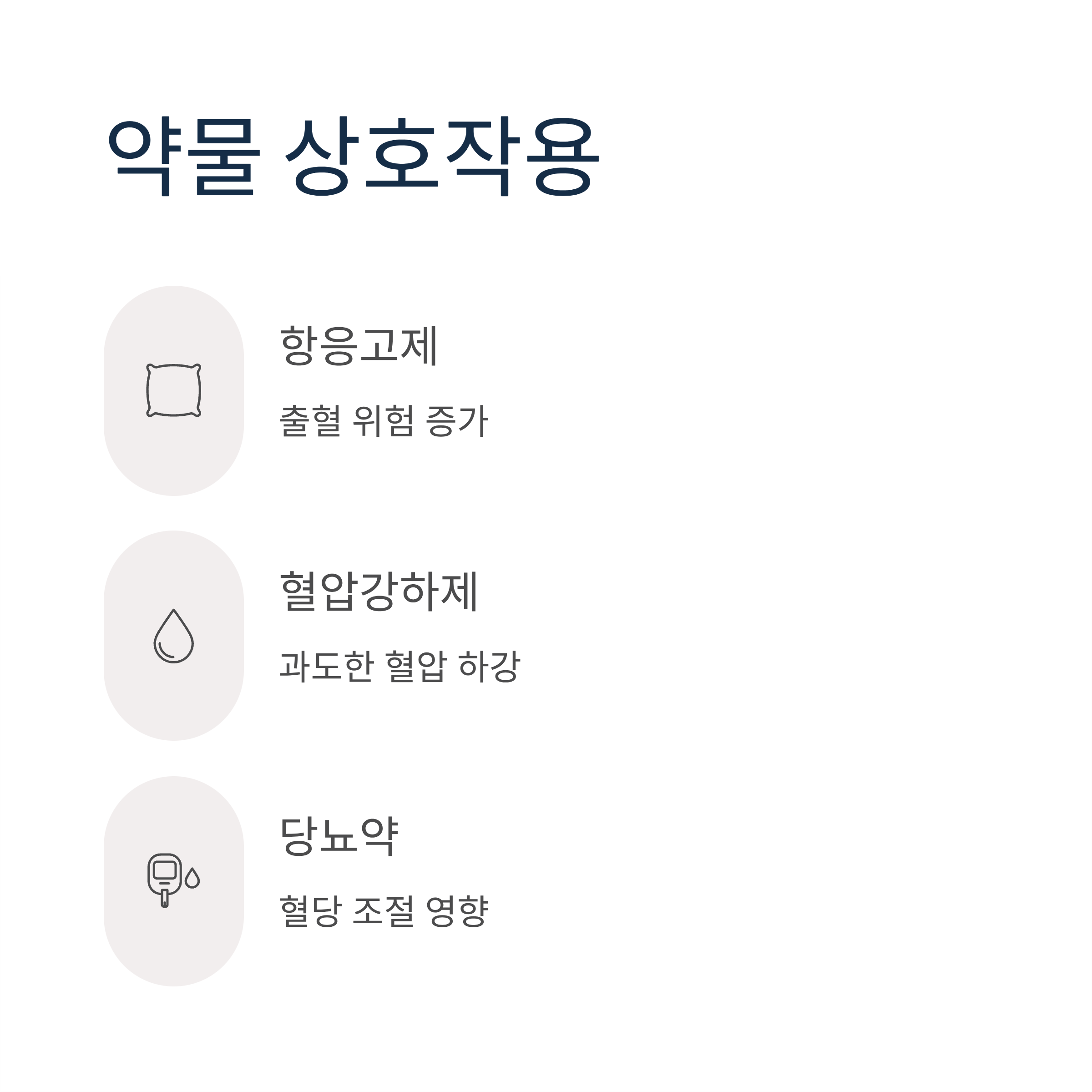 항응고제, 혈압강하제, 당뇨약 등을 복용 중인 경우 반드시 의사와 상담 후 섭취해야 합니다.