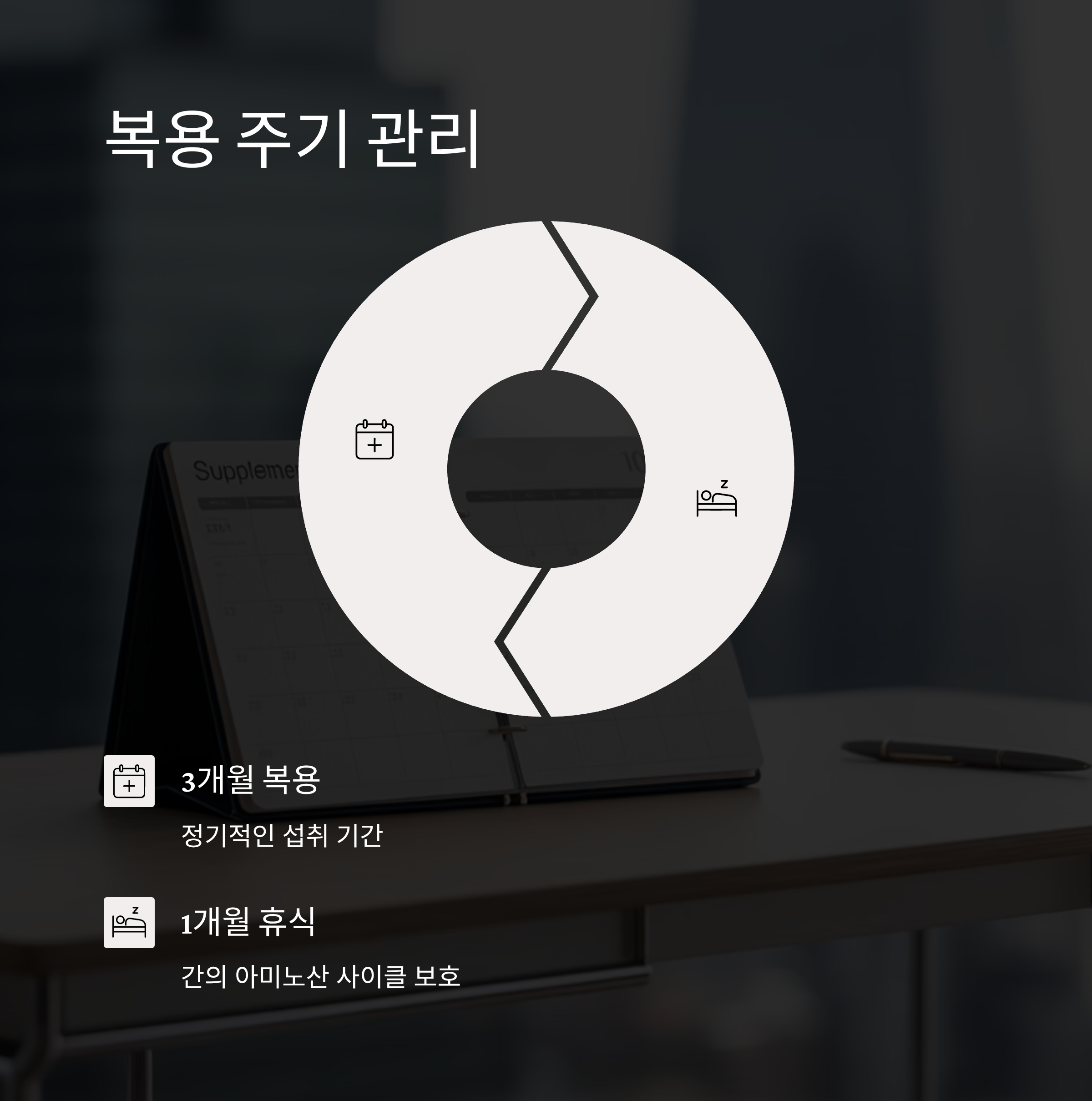 간의 아미노산 사이클에 무리를 줄 수 있으므로 3개월 복용 후 1개월 휴식하는 것을 권장합니다.