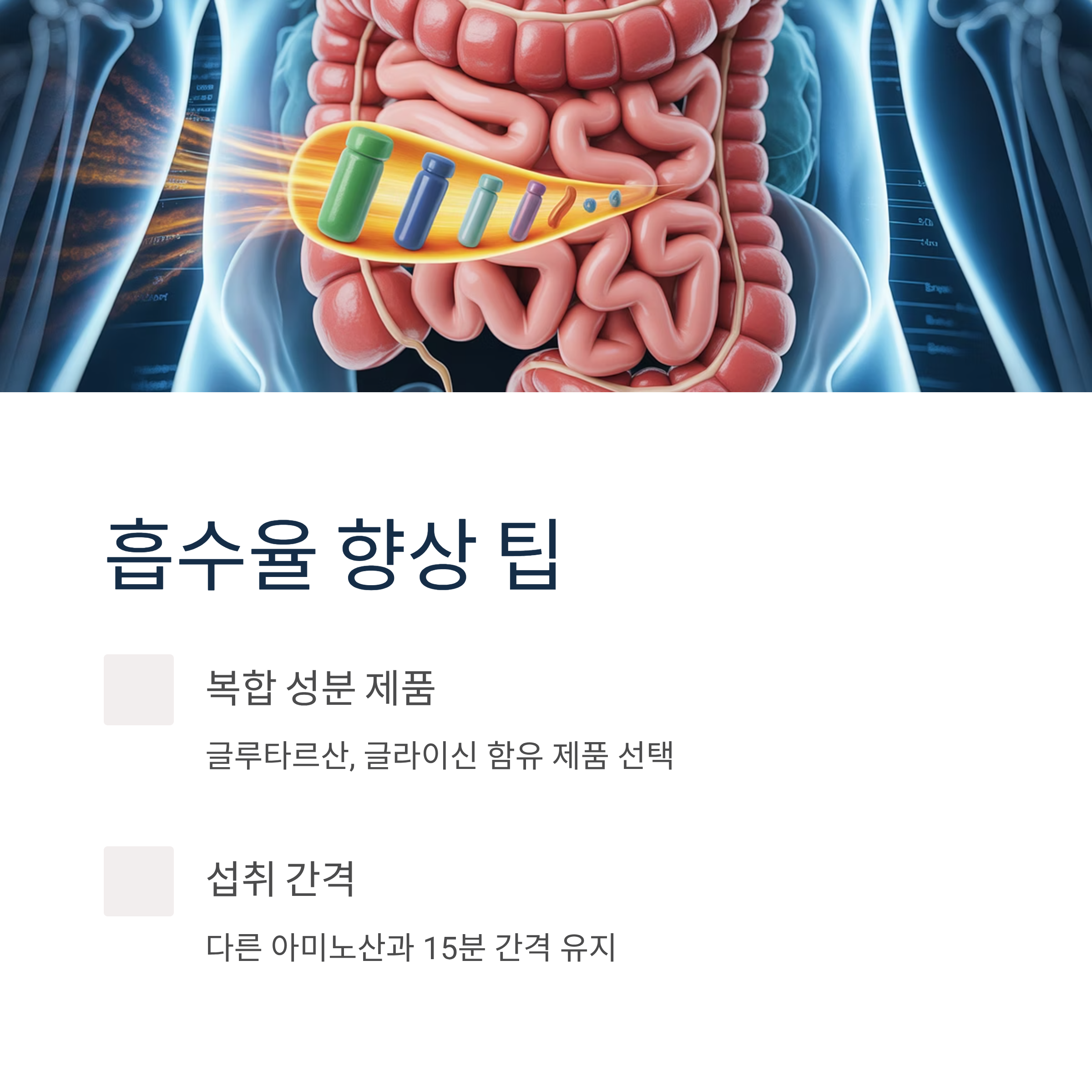 아르기닌은 흡수율이 낮은 편이므로 글루타르산이나 글라이신 등이 함께 포함된 제품을 선택하거나, 다른 아미노산과 15분 간격을 두고 복용하는 것이 좋습니다.